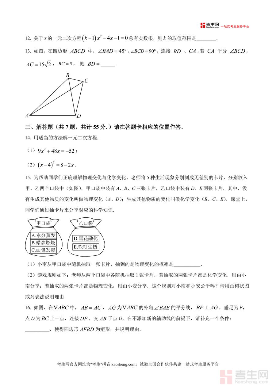 这份原卷资料核心用途为九年级学生的周测模拟练习与知识巩固,同时可作为数学教师备课及学情评估的参考工具。使用场景包括学生课后自主练习、班级周测实战模拟、教师选题组卷等;对学生而言,通过完成试卷可及时检测一元二次方程配方法、概率计算等知识点的掌握情况,提升应试能力;对教师而言,能借助校本题目了解学生阶段性学习效果,优化教学策略。其备考优势在于精准匹配该校教学内容,帮助学生提前适应校本题型特点,为后续单元测试及中考备考奠定基础。