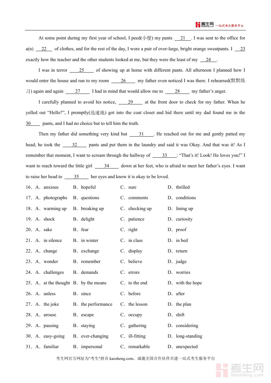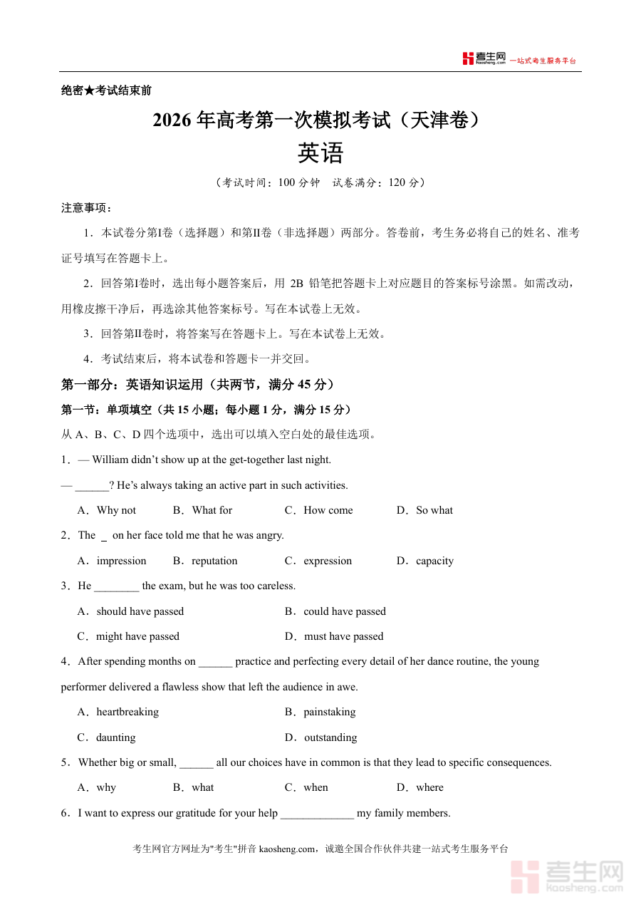《2026年高考英语第一次模拟考试(天津卷)(原卷版).docx》是一份严格遵循天津高考英语命题规范与最新考试大纲要求的高质量模拟测试资料,旨在为考生提供贴近真实考试场景的实战训练载体。该资料包含英语知识运用(单项填空、完形填空)等核心题型,严格按照100分钟考试时长、120分满分的标准设计,完整呈现了天津卷的题型结构与分值分布;其内容片段中展示的单项填空聚焦语法应用与词汇辨析,完形填空则融合叙事性文本与情感体验,体现了天津卷对语言综合运用能力的考查导向,为考生提供了极具参考价值的备考素材。