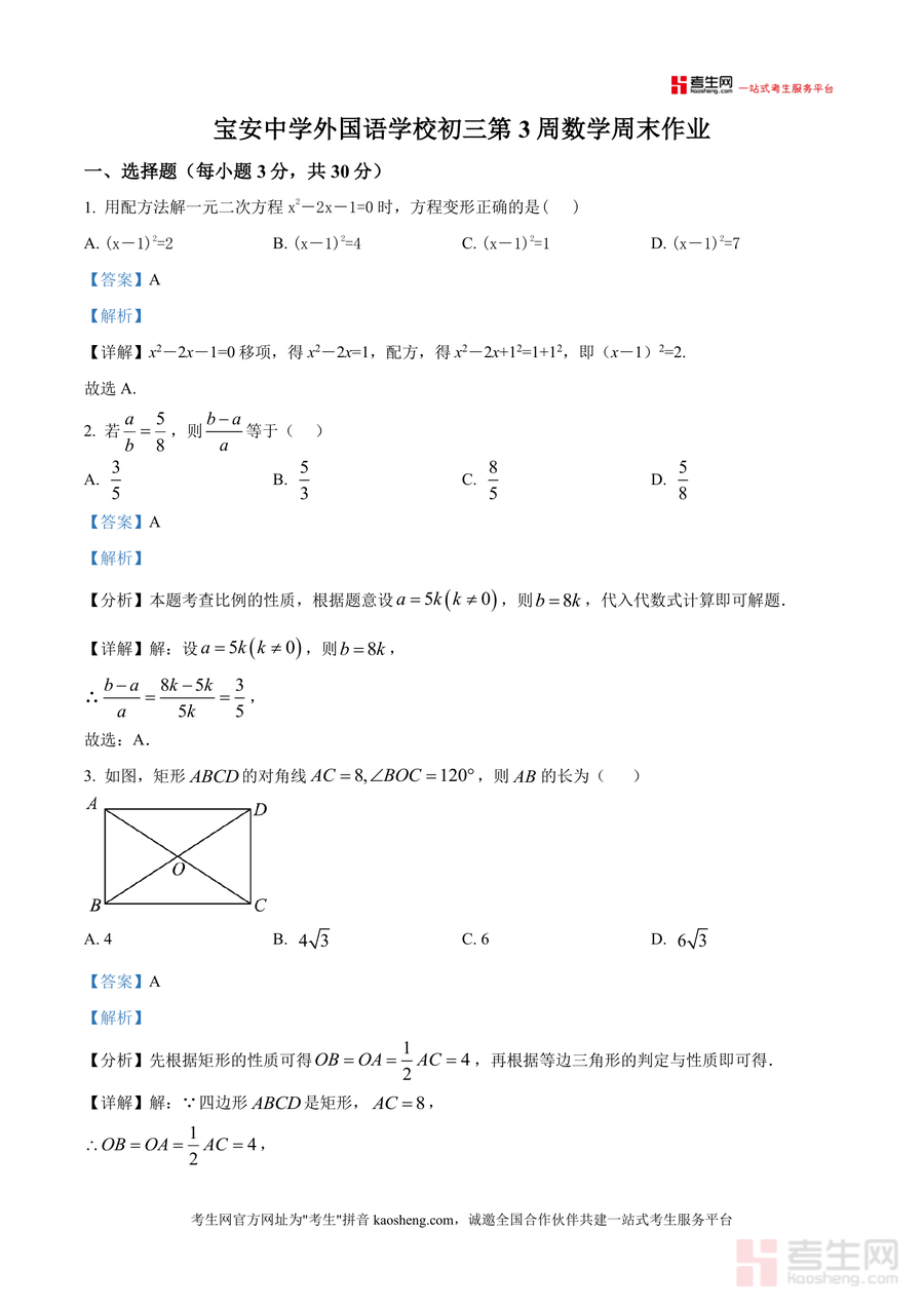 《精品解析:广东省深圳市宝安中学外国语学校2025-2026学年九年级上学期第三周周测数学试卷(解析版).docx》是一份针对该校九年级上学期第三周数学周测真题打造的专业备考资料,包含选择题(30分)、填空题(15分)及解答题(55分)三大题型,覆盖一元二次方程配方法与因式分解法求解、比例性质应用、矩形菱形正方形几何性质、概率计算等九年级上册核心知识点。其特色亮点在于每道题均配备精准答案与详尽解析,部分题目还补充了解题关键或易错点提示(如矩形性质与等边三角形判定结合题中的点睛说明),帮助使用者快速掌握考点对应的解题思路与方法。