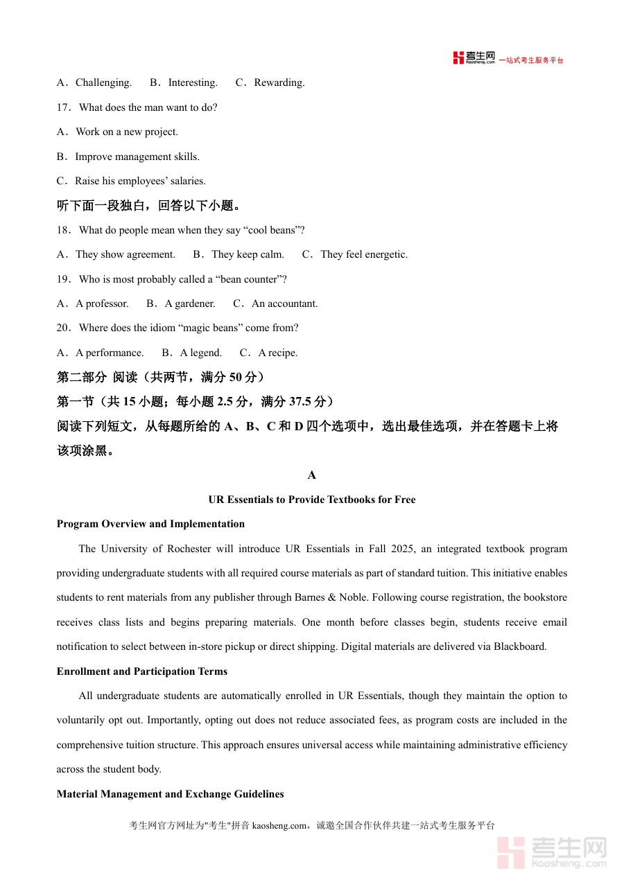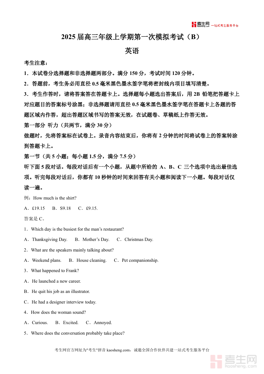 《精品解析:2025届贵州省遵义航天高级中学高三上学期第一次模拟考试英语试题(B)(原卷版)》是一份针对贵州省高三学生高考英语备考的优质真题解析类备考资料,严格遵循当地高考英语考试大纲及命题趋势,涵盖听力、阅读理解等核心考试模块。文档完整呈现了模拟考试的原始试卷结构,包含详细的考试规则说明(如答题工具要求、答题卡填涂规范)以及符合高考难度的各类题型(如听力对话理解、阅读理解选择题等)。其特色亮点在于结合遵义航天高级中学的教学经验与本地考试特点,为学生提供贴近真实高考场景的练习素材,助力考生提前熟悉考试流程与题型分布。