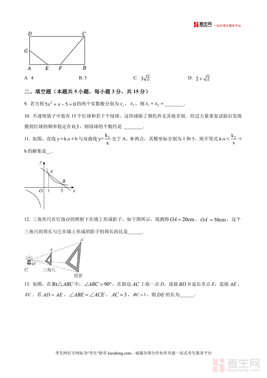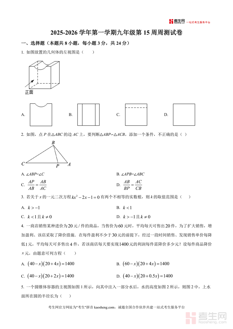 《精品解析:广东省深圳市红山中学附属学校2025-2026学年上学期九年级第15周周测数学试卷(原卷版).docx》是一份聚焦深圳市红山中学附属学校九年级学生阶段性数学学习成果的校考原卷资料,覆盖九年级上学期核心知识模块。该卷包含8道选择题(如几何体左视图判定、相似三角形条件分析、一元二次方程根判别式应用等)、5道填空题(含韦达定理计算、频率稳定性估计绿球数量、反比例函数与一次函数不等式解集等)及7道解答题(涵盖解方程、图形平移与位似变换、统计概率计算、几何菱形证明与边长求解、投石车杠杆几何应用及反比例函数综合探究等)。其特色在于严格遵循学校教学进度,贴合深圳本地命题风格,能真实反映学生阶段性知识掌握情况。
