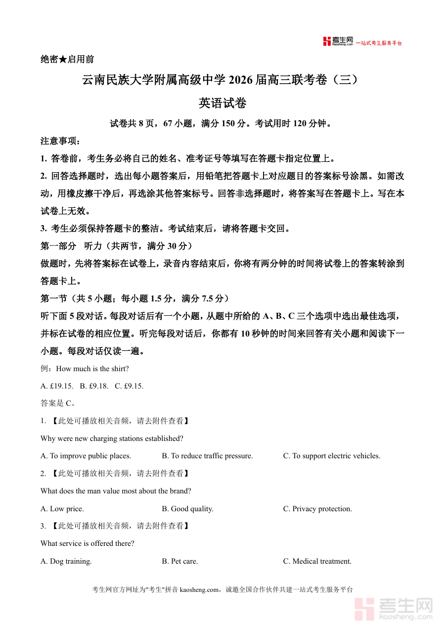 《精品解析:2026届云南省云南民大附中高三第三次联考模拟预测英语试题(原卷版)》是一份针对云南民族大学附属高级中学2026届高三学生设计的高质量模拟联考英语试卷原卷。该试卷严格遵循高考英语考试大纲要求,包含听力、阅读等核心题型(如听力两节共20小题、阅读两节共15小题等),全面覆盖词汇、语法、阅读理解、听力理解等关键考点。其特色亮点在于完全还原该校联考的真实试卷结构与难度,试卷共8页67小题,满分150分且考试用时120分钟,能为学生提供最贴近实际考试的场景体验,助力学生熟悉考试流程与题型分布。
