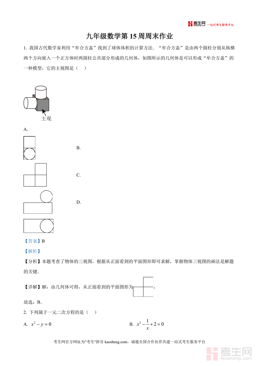 《精品解析:广东省深圳市龙岗区实验学校2025-2026学年上学期九年级数学第15周周末周测试卷(解析版).docx》是一份针对深圳市龙岗区实验学校九年级学生数学阶段性复习备考需求打造专业真题解析资料。该资料基于学校第15周周末周测试卷展开深度剖析,覆盖三视图识别、一元二次方程定义与解法、平行线分线段成比例、相似三角形判定与应用、反比例函数实际应用等九年级上学期核心知识点;每道题目均配备完整解析包含考点分析、解题思路拆解及易错点提示,如第4题配方法解一元二次方程步骤明确第7题通过相似三角形性质推导液面高度帮助学生精准把握解题逻辑。