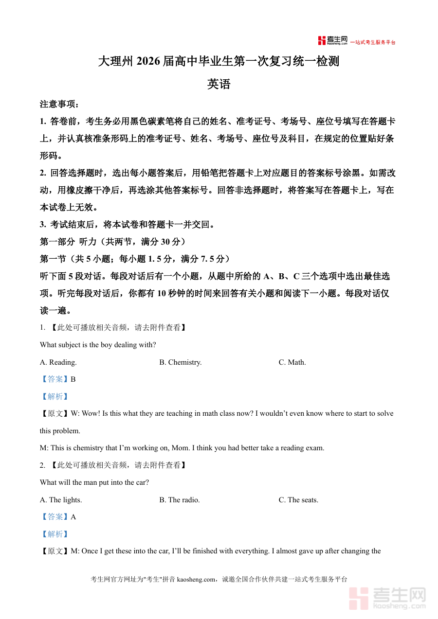 《精品解析:2026届云南省大理白族自治州高三上学期第一次复习统一检测英语试题(解析版)》是一份针对大理州高三学生首轮复习阶段的高质量英语备考资料。该资料完整呈现本次统一检测试题全貌,涵盖听力(两节共20小题)等核心题型,并配套详尽解析内容。每道听力题均提供原文转录及精准答案分析,如第一节第1题通过母子对话细节明确答案为Chemistry,并解释排除Math和Reading选项的逻辑;第二节较长对话或独白的解析则梳理对话逻辑与关键信息点,帮助学生掌握听力理解技巧。此外资料严格遵循考试规范,还原真实考场要求,是兼具权威性与实用性的真题解析范本。