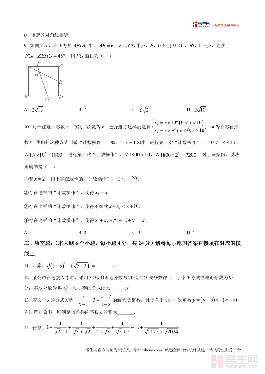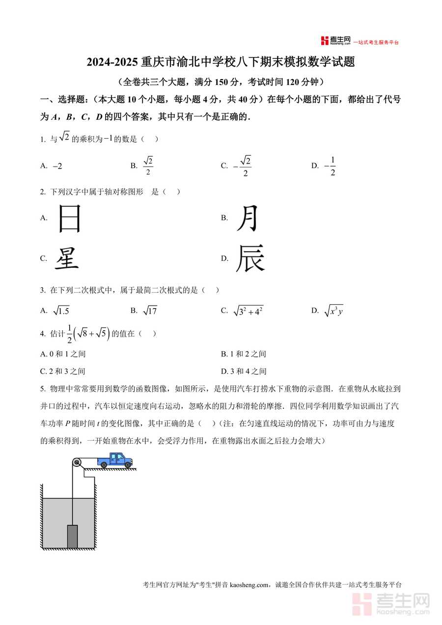《精品解析:重庆市渝北中学校2024-2025学年八年级下学期6月期末模拟数学试题(原卷版)》是一份针对该校八年级下学期数学期末考设计的高质量备考资料。该试题严格遵循重庆市初中数学教学大纲及该校期末命题规律,覆盖二次根式运算、轴对称图形识别、一次函数图像分析、几何证明等核心知识点;题型设置包含选择题(10小题)、填空题(6小题)、解答题(9小题),与真实期末考卷结构一致;特色在于融入该校教学重点,如函数与物理场景结合应用题、几何图形变换探究题等,能有效反映该校期末考命题方向。