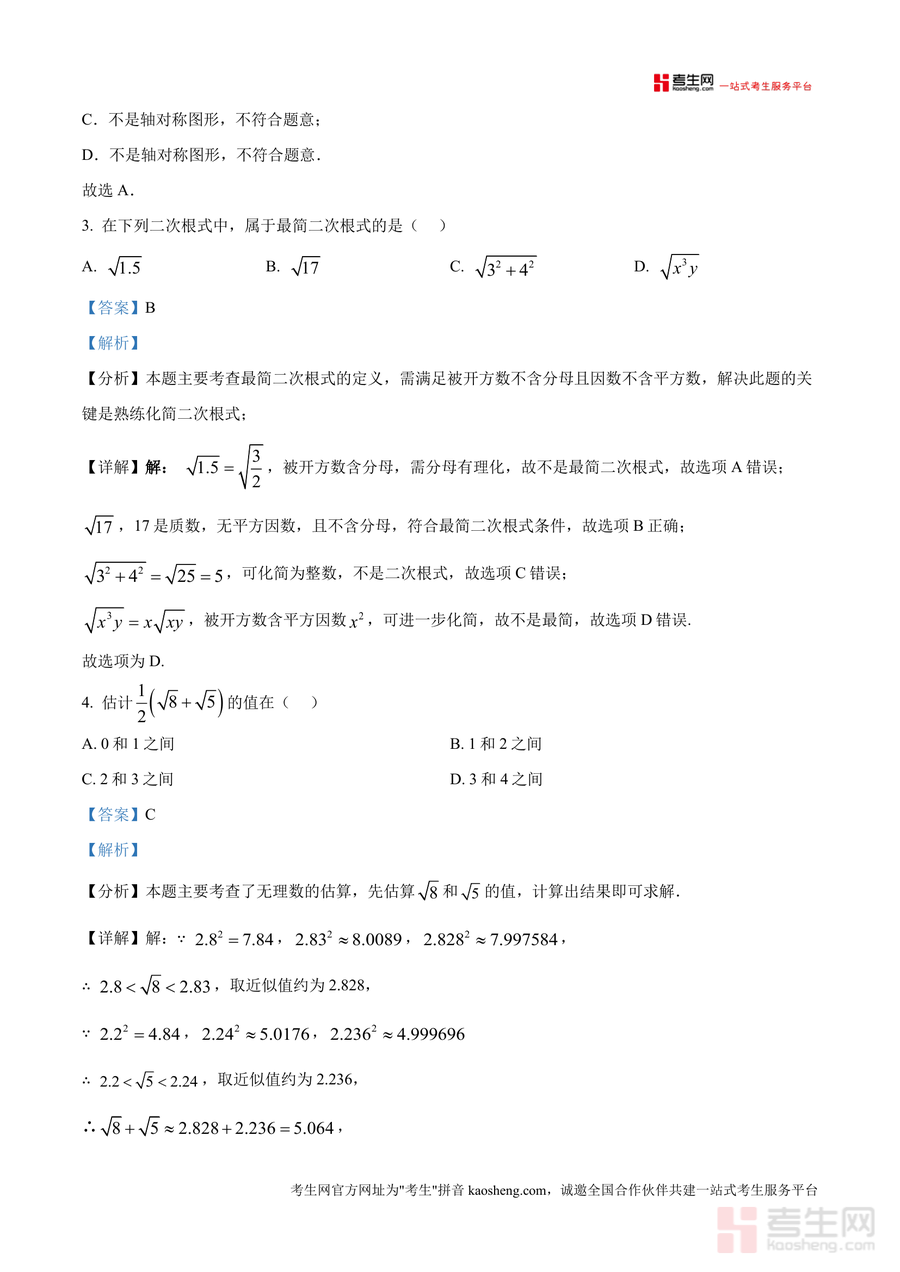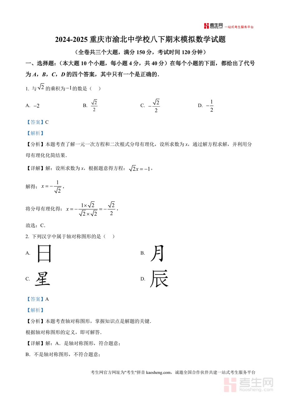 《精品解析:重庆市渝北中学校2024-2025学年八年级下学期6月期末模拟数学试题(解析版).docx》是一份针对八年级下学期数学期末备考设计 的高质量真题解析资料,核心内容覆盖全卷三大题(选择、填空、解答)共86分题型,涵盖代数运算、几何图形、函数应用等八年级下册数学核心模块。特色亮点在于每道试题均配备详细思路分析、步骤拆解及易错点提示:选择题部分针对二次根式化简、轴对称图形判断等基础考点,解析补充分母有理化、轴对称定义等关键知识点;解答题部分注重逻辑推导,如不等式组求解明确步骤规范及数轴表示方法,帮助学生建立清晰解题框架。