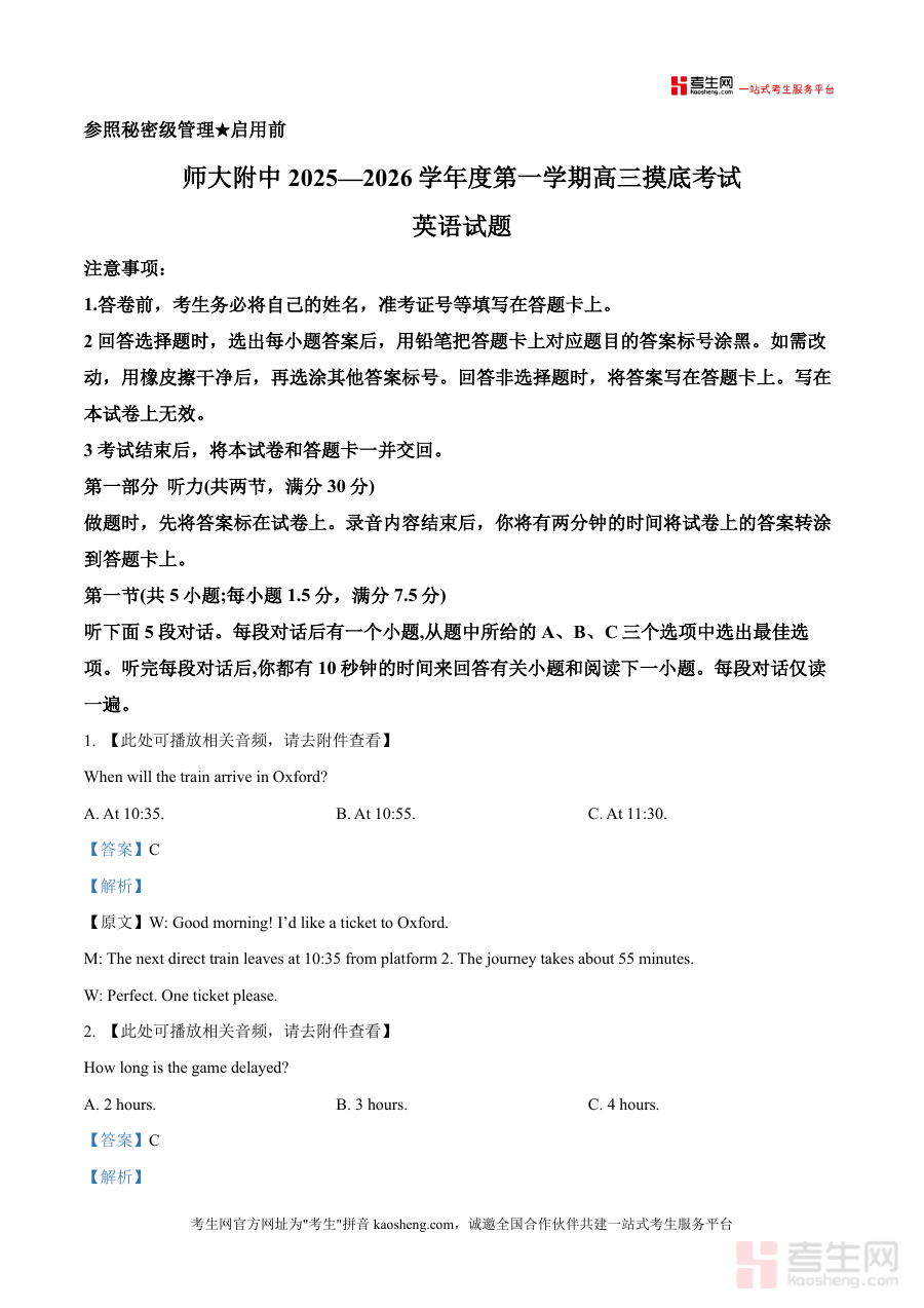 《精品解析:2026届山东省济南市历下区山东师范大学附属中学高三上学期一模英语试题(解析版)》是一份针对高三学生英语备考的专业真题解析资料,核心定位为辅助提升应试能力与知识掌握的优质备考资源。该文档包含完整的一模考试试题及每道题目的详细解析,覆盖听力等核心题型,其中听力部分提供音频附件参照及原文转录、答案推导过程,帮助用户精准理解题目逻辑。其特色亮点在于结合山东本地高考命题趋势,对考点进行深度拆解,并融入答题技巧指导,为使用者提供兼具针对性与实用性的学习支持。