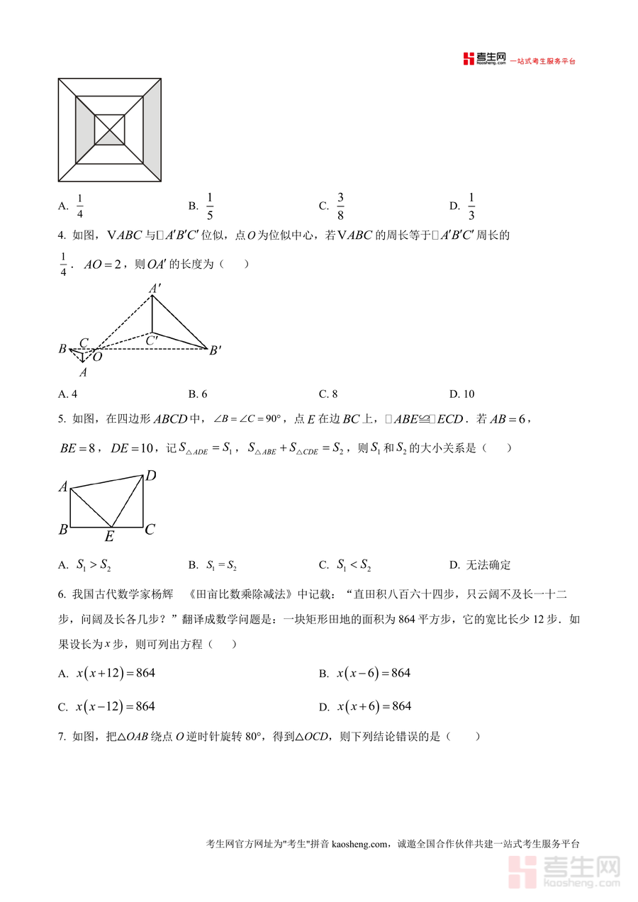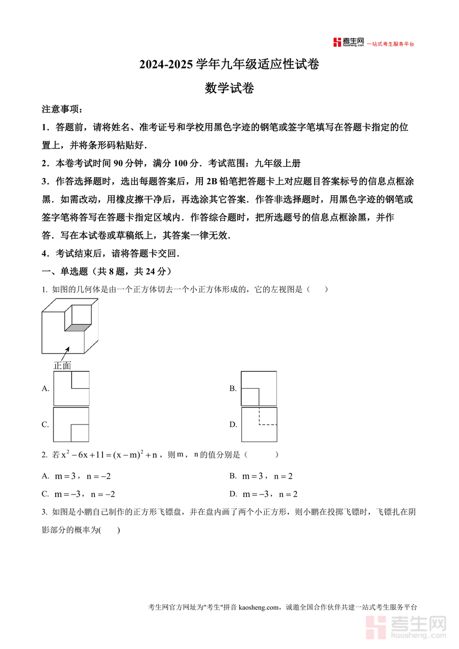 《精品解析:广东省深圳市2024-2025学年上学期九年级数学适应性试卷(原卷版).docx》是一份针对深圳地区九年级学生设计的阶段性数学适应性训练资料,聚焦九年级上册核心知识点,涵盖单选题、填空题、解答题三大题型,共计21道题目(8道单选、5道填空、8道解答)。试卷严格遵循深圳本地数学考试规范,考试时间90分钟、满分100分,题型设置贴合深圳中考命题趋势,包含几何图形视图、方程求解、概率计算、相似与位似图形、函数应用等高频考点,能全面检测学生对九年级上册知识的掌握程度。