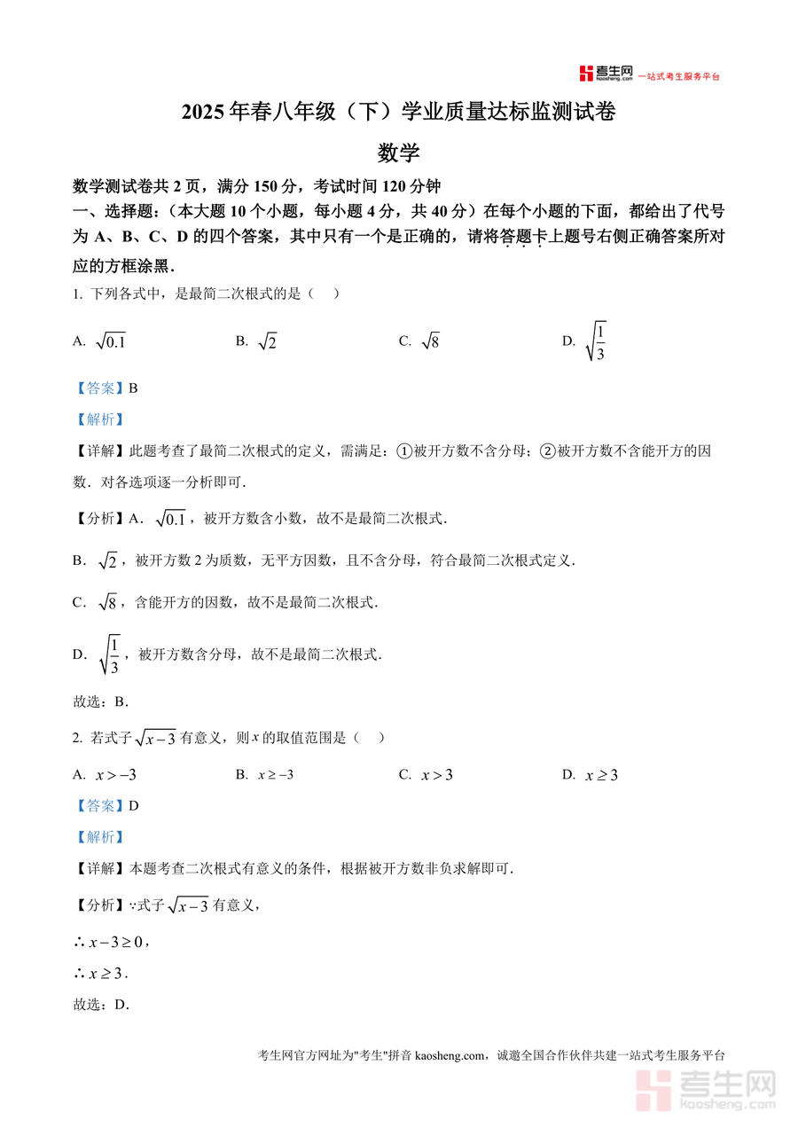 《精品解析:重庆市潼南区2024-2025学年八年级下学期期末考试数学试题(解析版).docx》是一份针对潼南区八年级下学期数学期末测评需求开发精准化真题解析备考资料。该资料包含完整试题及逐题深度解析,覆盖选择、填空、解答全题型。特色亮点在于解析过程融入知识点溯源(如最简二次根式定义、一次函数图象性质等核心考点)、解题方法提炼(如特殊值代入法验证代数恒等式)及易错点标注,帮助使用者清晰理解考点关联与答题逻辑。