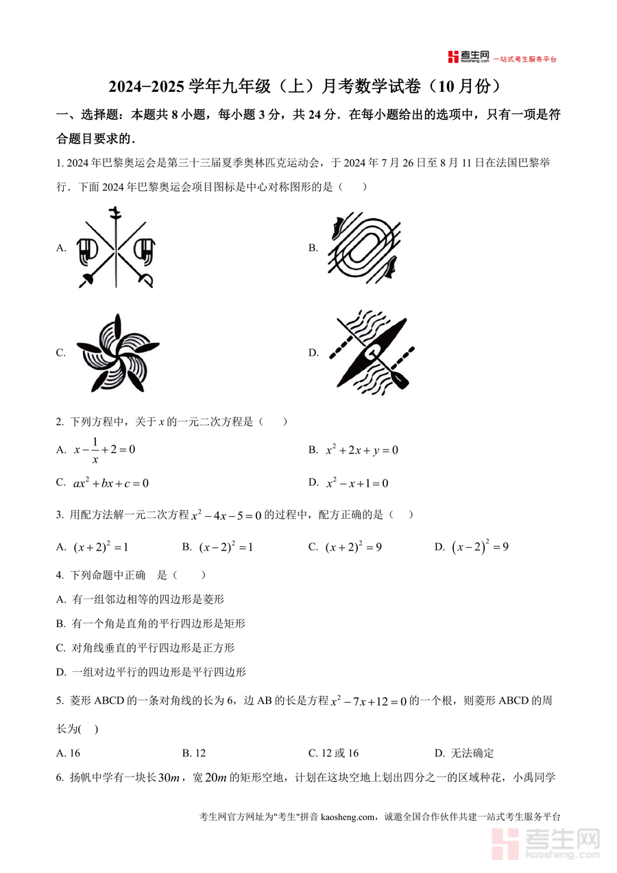《精品解析:广东省深圳市2024-2025学年九年级上学期数学试卷(10月份)(原卷版).docx》是一份针对深圳市九年级学生10月月考设计的高质量备考资料。该试卷严格遵循深圳本地教学大纲与考试说明,涵盖九年级上册数学核心知识点,包括中心对称图形识别、一元二次方程求解与应用、菱形矩形正方形等特殊四边形性质、几何作图及综合实践问题等。试卷结构完整,包含8道选择题(每小题3分)、5道填空题(每小题3分)及7道解答题(共61分);题型设置贴合深圳月考命题规律,保留真实考试场景,能有效还原考场体验,为学生提供精准训练载体。