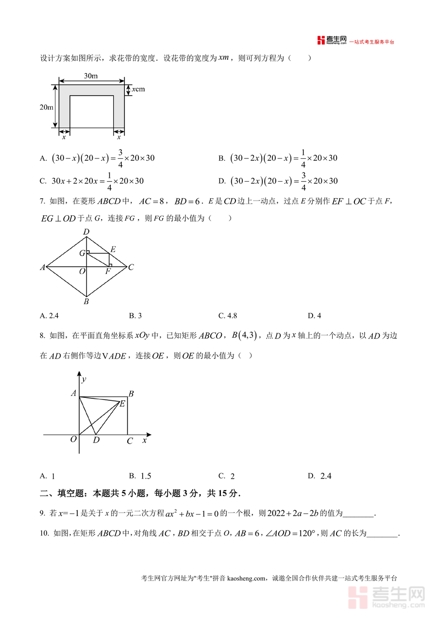 该试卷核心用途在于帮助学生熟悉月考题型结构与难度梯度,提升应试能力。使用场景广泛:学生可用于自主复习后的模拟测试,检测知识掌握程度;教师可作为课堂练习或单元检测素材,评估教学效果;家长可辅助孩子进行考前针对性训练。其备考优势显著:通过原卷版训练,学生能提前适应深圳本地考试命题风格,精准把握高频考点与易错点,例如一元二次方程配方法应用、菱形周长计算中的分类讨论问题等,从而高效提升解题技巧与应试信心。