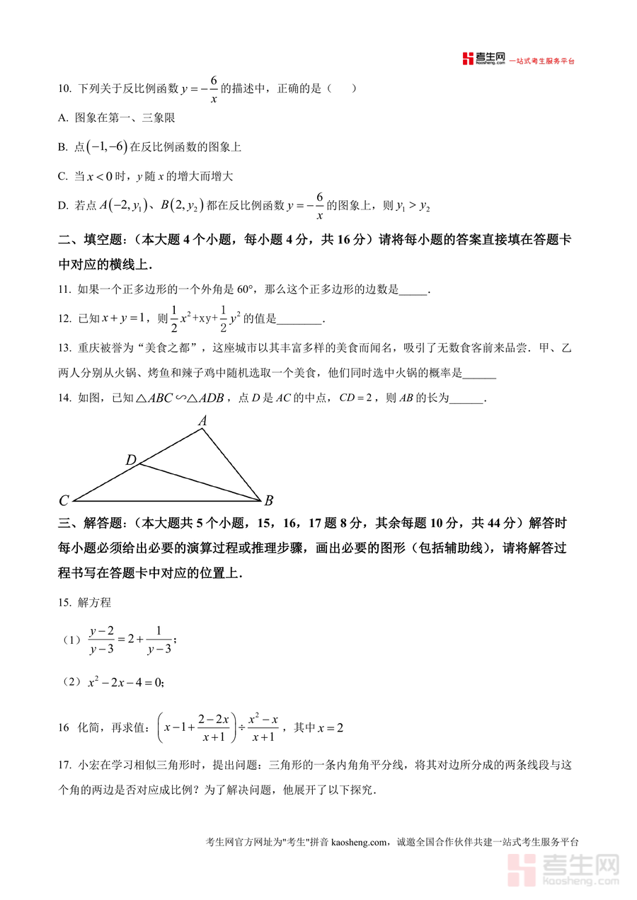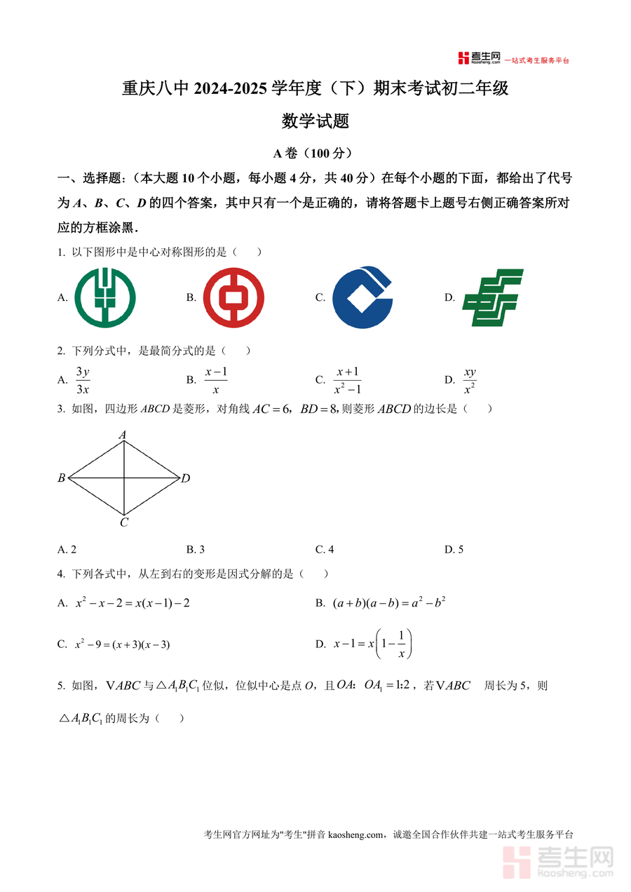 《精品解析:重庆市第八中学校2024-2025学年八年级下学期期末考试数学试题(原卷版)》是一份聚焦重庆八中八年级数学期末测评要求,承载该校命题特色与教学导向的权威真题资料。资料包含A卷(100分)与B卷(50分)完整试题结构,涵盖选择题(如中心对称图形判断、分式最简形式识别)、填空题(正多边形边数计算、概率求解)、解答题(方程求解、相似三角形探究、统计分析等)三大题型,全面覆盖八年级下册数学核心知识点,如菱形性质、一元二次方程根应用、反比例函数图像特征等。其特色在于贴合重庆八中教学进度与命题风格,试题设计既注重基础概念考查,又融入能力拓展题型(如规律探究题、几何综合题),能真实反映该校期末测评难度与方向。