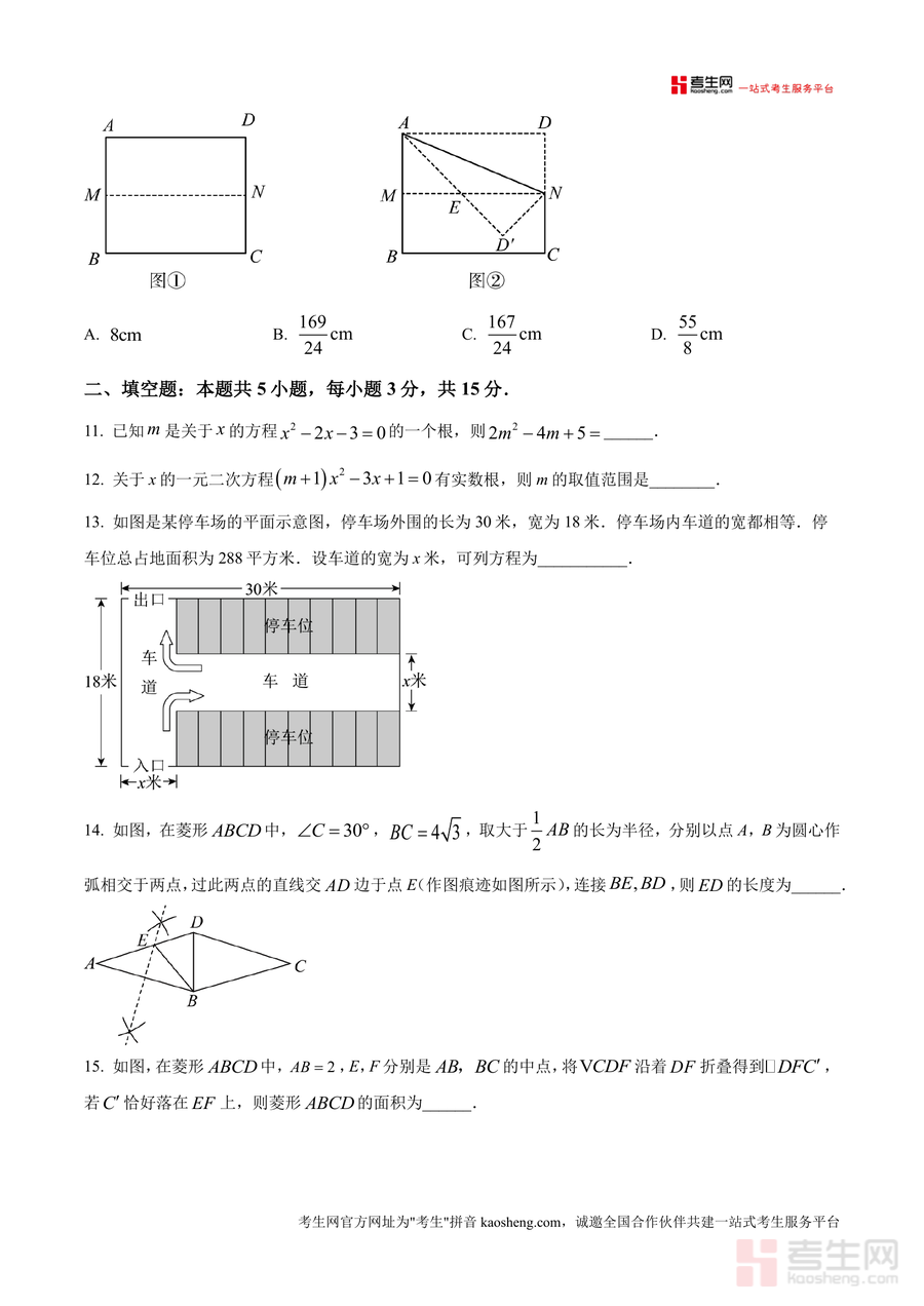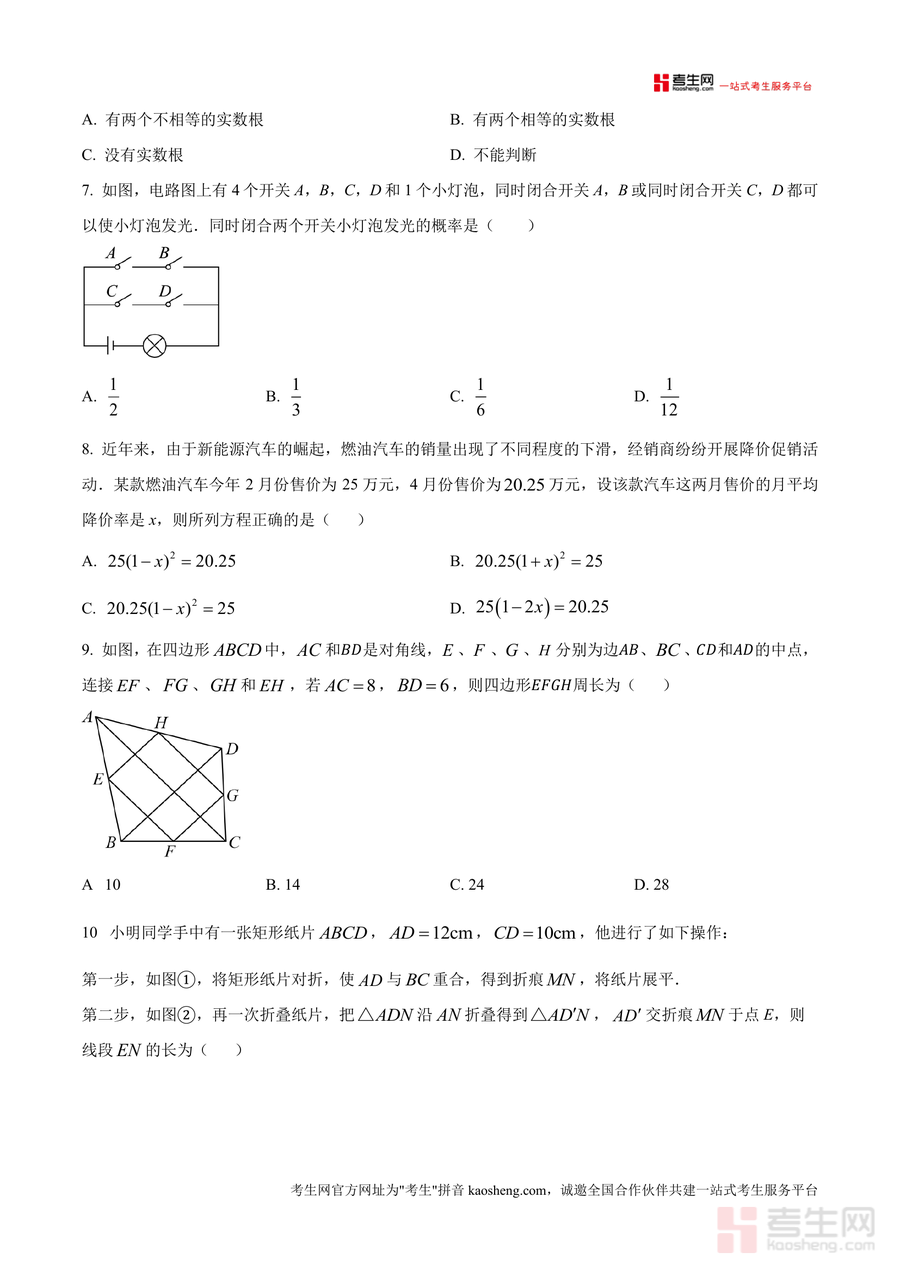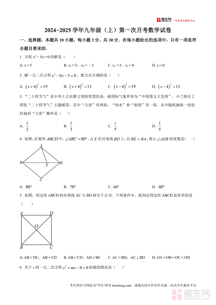 《精品解析:广东省深圳市2024-2025学年九年级上学期第一次月考数学试卷(原卷版).docx》是一份针对深圳市九年级学生数学学科第一次月考设计的高质量备考资料。该资料完整呈现了月考数学试卷原卷形式及题型结构——包含10道选择题、5道填空题与7道解答题,覆盖一元二次方程求解及应用、概率计算、菱形/矩形/等腰三角形等几何图形性质及综合应用等核心知识点。其特色亮点在于严格遵循深圳市九年级数学教学进度与本地考纲要求编制试题,并精准还原真实考试的分值分布与命题风格,为用户提供贴合本地实际考试场景的训练素材。