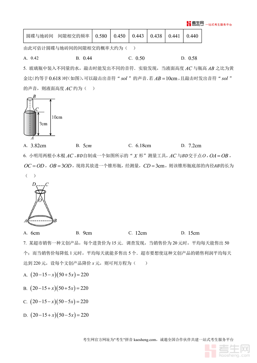 《精品解析:2025年广东省深圳市中考数学适应性试卷(原卷版).docx》是一份针对2025年深圳市中考数学学科设计的高质量备考资料。该试卷严格遵循深圳市中考数学命题大纲要求,涵盖选择题(8小题)、填空题(5小题)、解答题(7小题)三大题型及代数、几何、统计概率等核心模块,总分为100分且题型结构与分值分布完全贴合深圳中考实际。试卷特色在于融入本地文化元素与生活场景——如以月饼盒俯视图考查空间几何直观想象能力、以文创产品销售利润考查方程实际应用能力等——既体现学科知识实用性,又增强考生对本地命题风格的熟悉度,为备考提供精准导向。