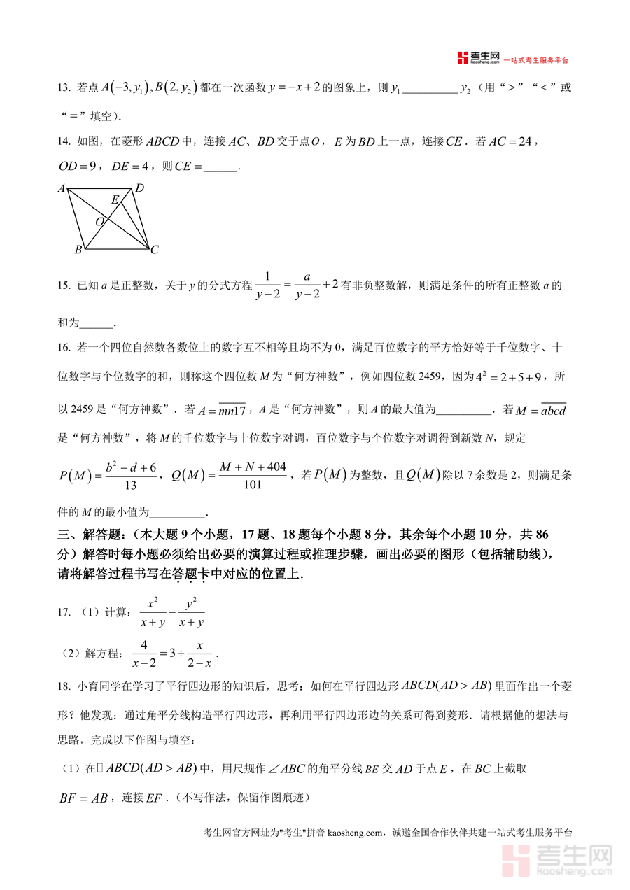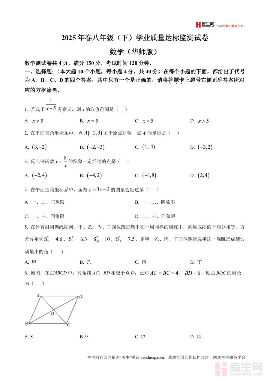 《精品解析:重庆市黔江区2024-2025学年八年级下学期期末考试数学试题(原卷版).docx》是一份针对黔江区八年级下学期数学期末备考设计的权威真题资料,以华师版教材为依托,严格遵循当地学业质量监测要求。资料包含完整的考试原卷结构:满分150分、考试时长120分钟,题型覆盖选择题(10小题)、填空题(6小题)及解答题(9小题),内容涉及分式运算、反比例函数、平行四边形与菱形性质、统计方差等核心知识点,全面贴合课标要求与教学进度,能精准反映本地期末考的命题方向与难度梯度。