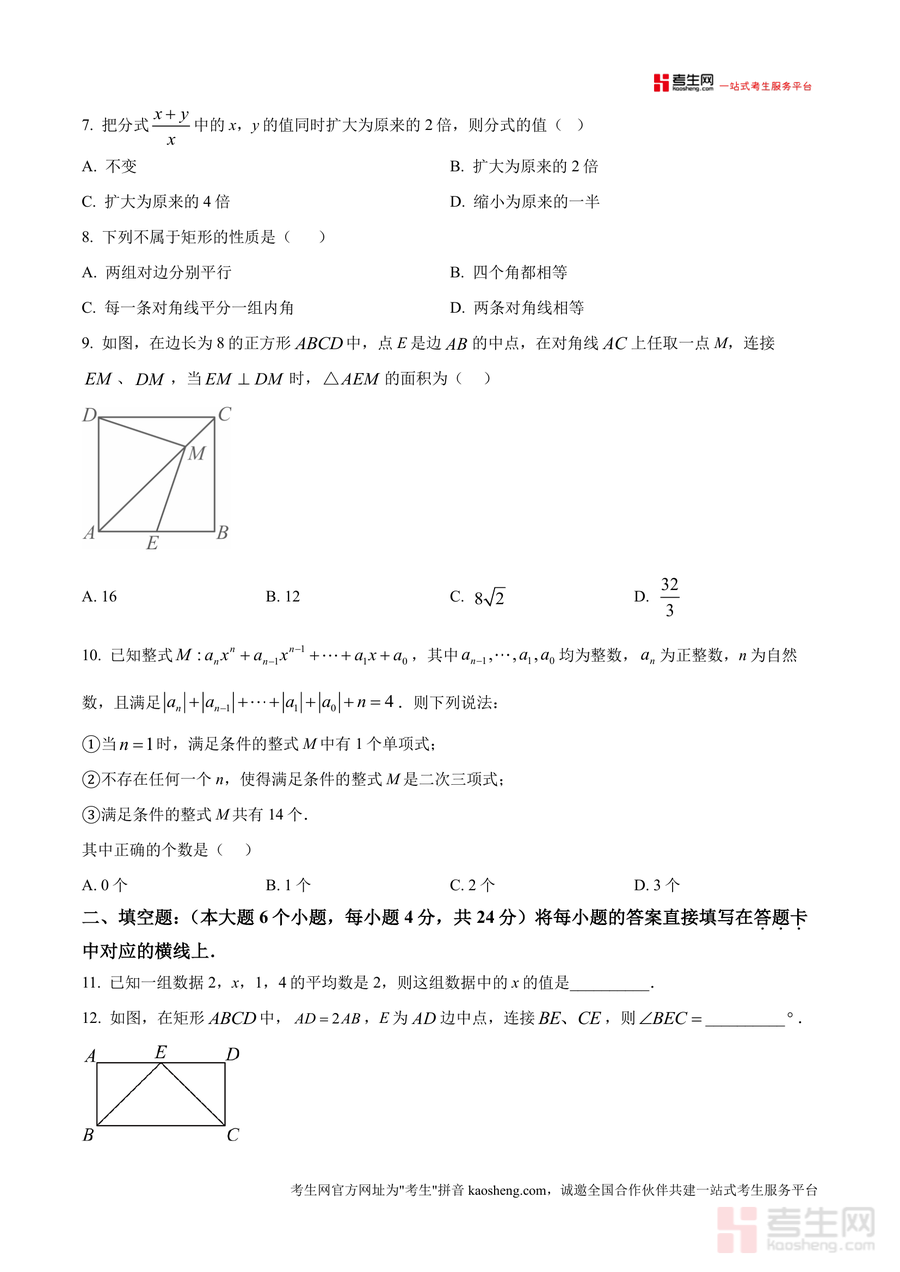 本资料适用于重庆市黔江区八年级在读学生、初中数学教师及数学备考辅导人员。作为本地最新期末真题原卷,它不仅是期末备考不可或缺核心资料,更具有不可替代性——其还原真实考试情境与命题特点,能帮助使用者精准对接考点;长期来看,它可作为后续阶段复习重要参考素材,助力知识体系巩固与深化,为后续数学学习奠定坚实基础。