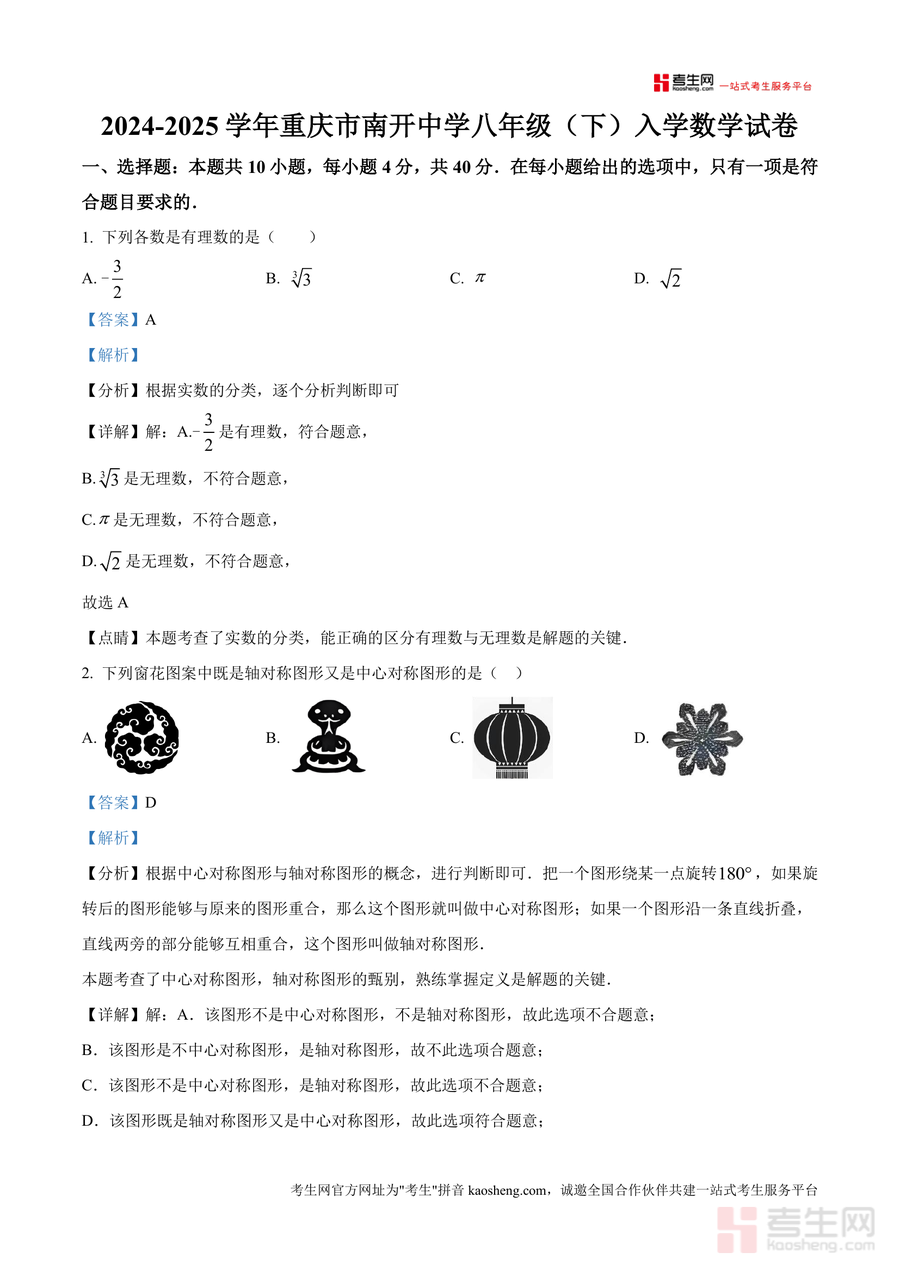 《精品解析:重庆市南开中学校2024-2025学年下学期八年级入学数学试卷-(解析版).docx》是一份面向八年级学生衔接下学期数学学习需求打造高质量备考资料,涵盖选择题(10小题)、填空题(8小题)等典型题型,包含实数分类、轴对称与中心对称甄别、不等式组解集判定等核心知识点,依托南开中学名校命题资源,每道题配备详细分析、规范解答及点睛提示,深度拆解解题逻辑,助力学生精准掌握考点。