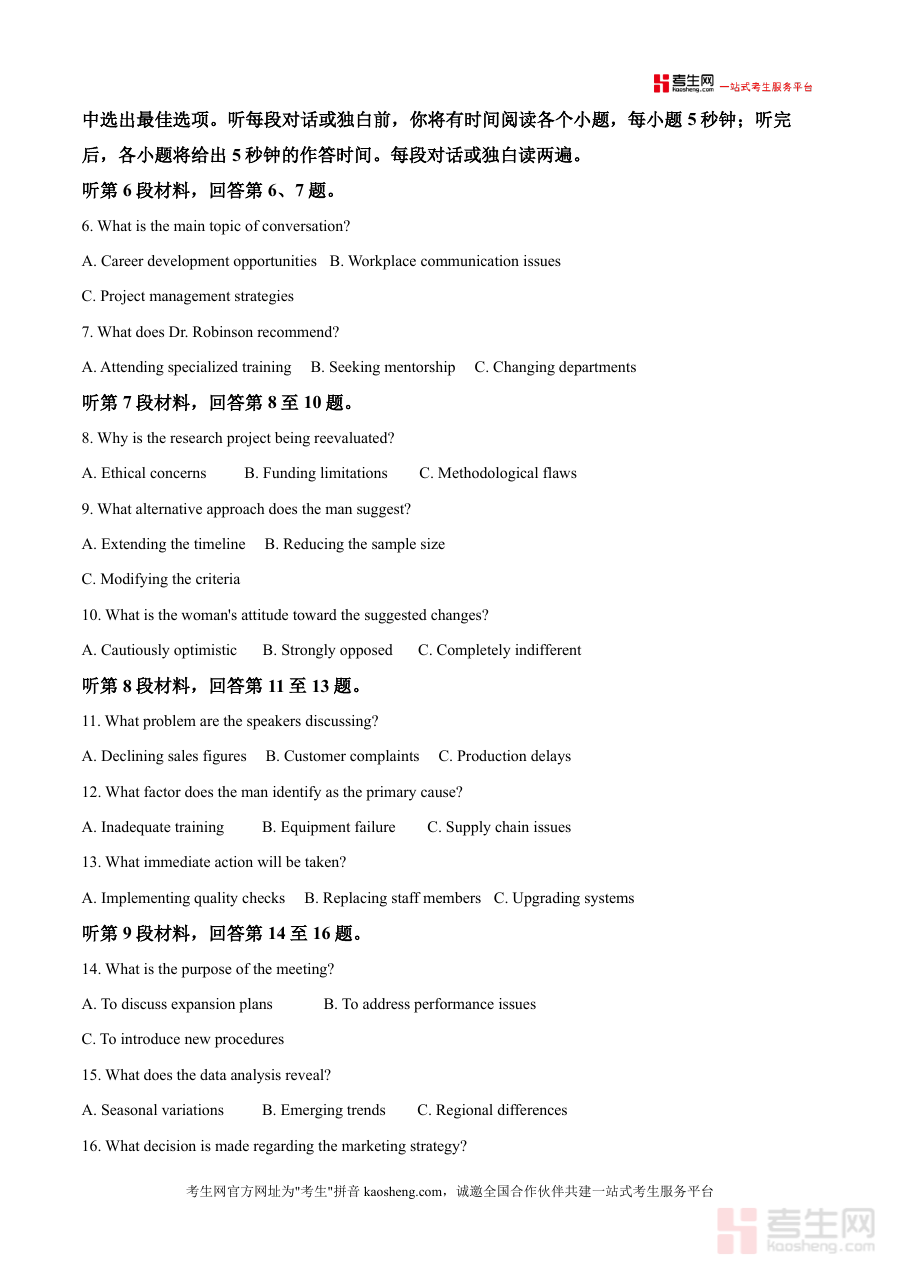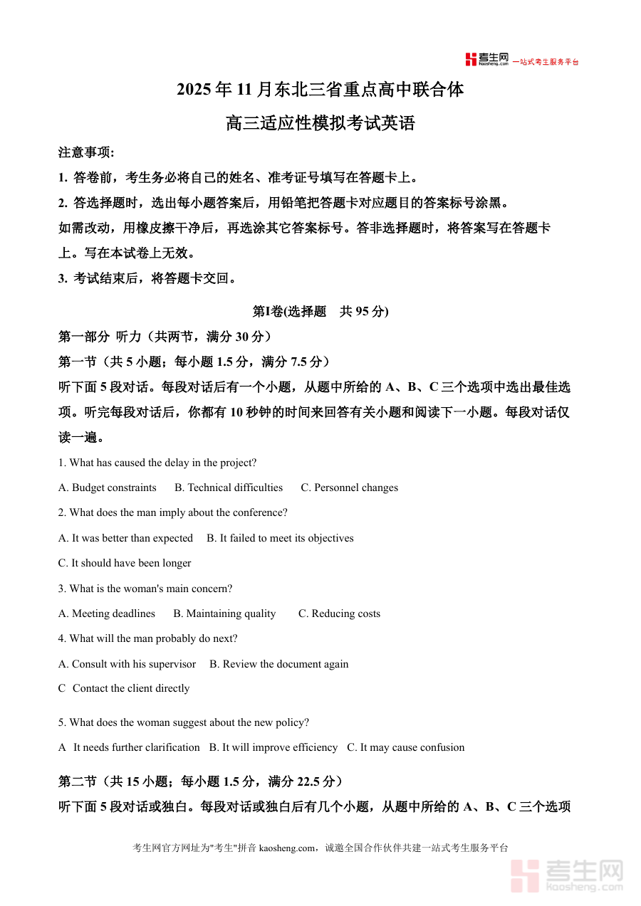 《精品解析:东北三省重点高中联合体2025-2026学年高三上学期11月适应性模拟考试英语试卷(原卷版)》是一份针对高三学生英语学科备考的高质量区域性模拟考试资料。该试卷由东北三省重点高中联合体联合命制,严格遵循最新高考英语考试大纲要求,涵盖听力、阅读等核心题型,题型设置与分值分布完全匹配高考标准。其特色在于试题选材贴近学生生活与社会热点,听力部分采用真实场景对话与独白,阅读材料涵盖环保、职场等多元主题,能够有效检测学生的语言应用能力与综合素养。