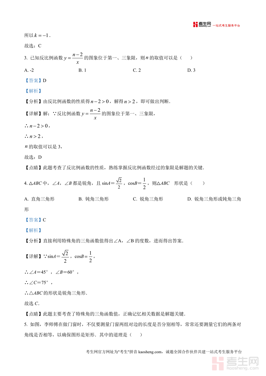 《精品解析:广东省深圳外国语学校2024-2025学年九年级上学期第一次月考数学试题(解析版).docx》是一份针对深圳外国语学校九年级学生首次月考的专业数学真题解析资料。该资料包含完整试题及逐题深度解析,覆盖九年级上册核心知识点:三视图识别、一元二次方程根与系数关系及解法、反比例函数图像性质、特殊角三角函数值应用、几何图形(矩形、平行四边形、菱形)判定与性质、解直角三角形实际应用等。其特色亮点在于每道题均配备"分析-详解-点睛"三段式解析:如选择题中对三视图观察角度及易错点说明,填空题里对一元二次方程判别式条件严谨推导,解答题中分步骤呈现几何辅助线构造思路与代数运算规范,帮助学生不仅知其然更知其所以然。