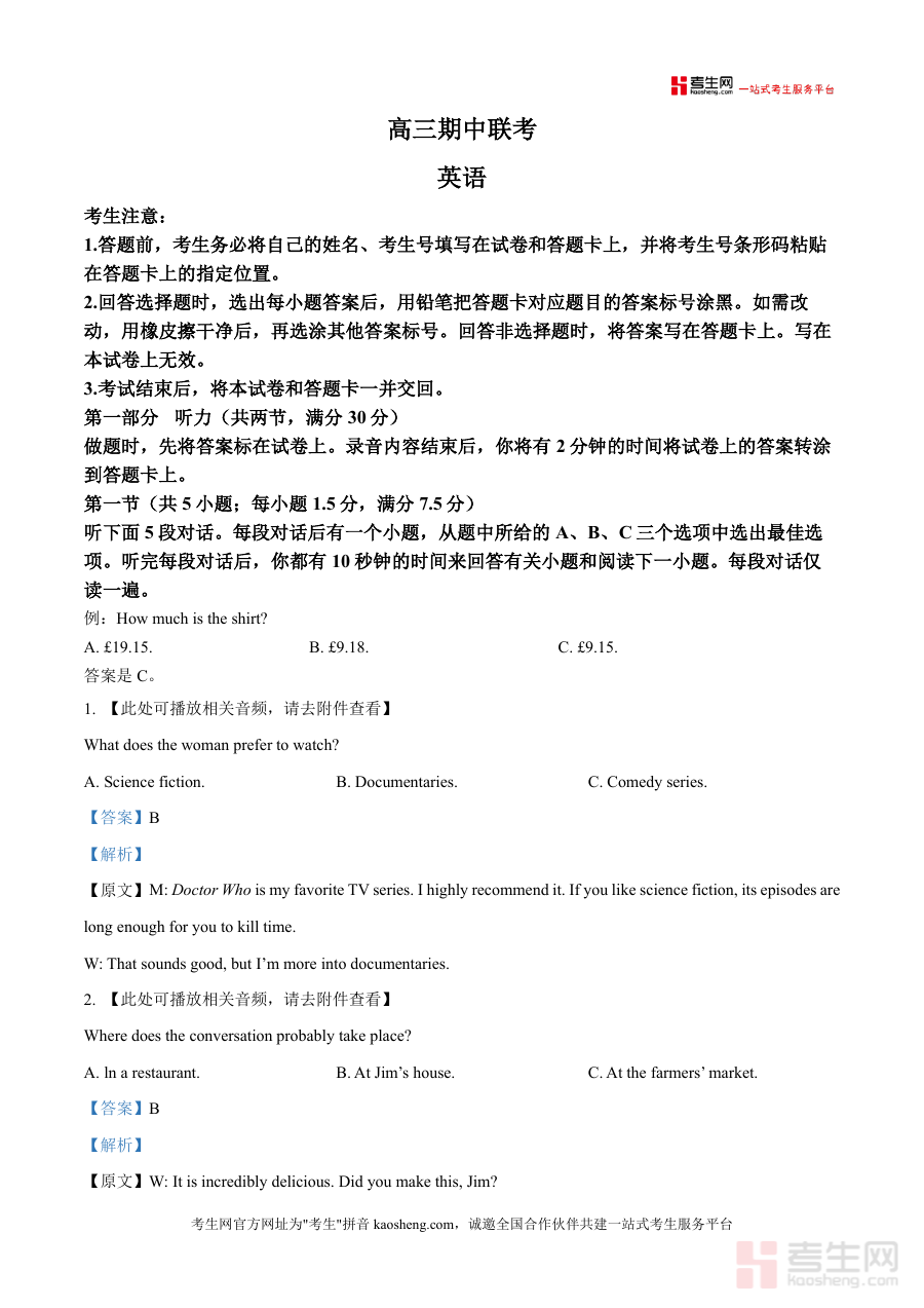 《精品解析:安徽省2025-2026学年高三上学期期中大联考英语试卷(解析版)》是一份针对安徽省高三学生期中复习与备考的专业教育资料,核心定位为帮助学生深入理解联考英语试卷的命题规律与解题思路。文件包含完整的试卷内容(如听力部分的对话原文、题目选项及答案)以及每道题的详细解析,覆盖听力等多个题型;其特色亮点在于结合本地联考的命题特点,对各题目的考查要点、易错点进行精准剖析,并融入解题技巧指导,是兼具权威性与实用性的真题解析资源,能有效助力学生提升应试能力。