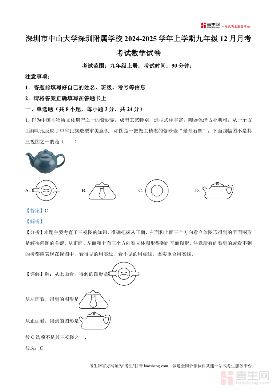 《精品解析:广东省深圳市中山大学深圳附属学校2024-2025学年上学期九年级12月月考考试数学试卷(解析版)》是一份针对深圳本地化校考需求打造的确切真题解析备考资料,聚焦九年级上册核心知识模块。该资料完整呈现本次月考数学试卷全貌(考试范围含三视图、相似三角形、一元二次方程等九年级上册内容)及深度解析,题型覆盖单选题(8小题)、填空题(5小题)、解答题(7小题)三大类别;其特色亮点在于每道题均配备考点定位、思路剖析与步骤拆解,如针对三视图题目明确虚实线识别规则、相似三角形题目强调对应边比例关系验证,同时补充易错点提示,帮助学生精准理解命题意图。