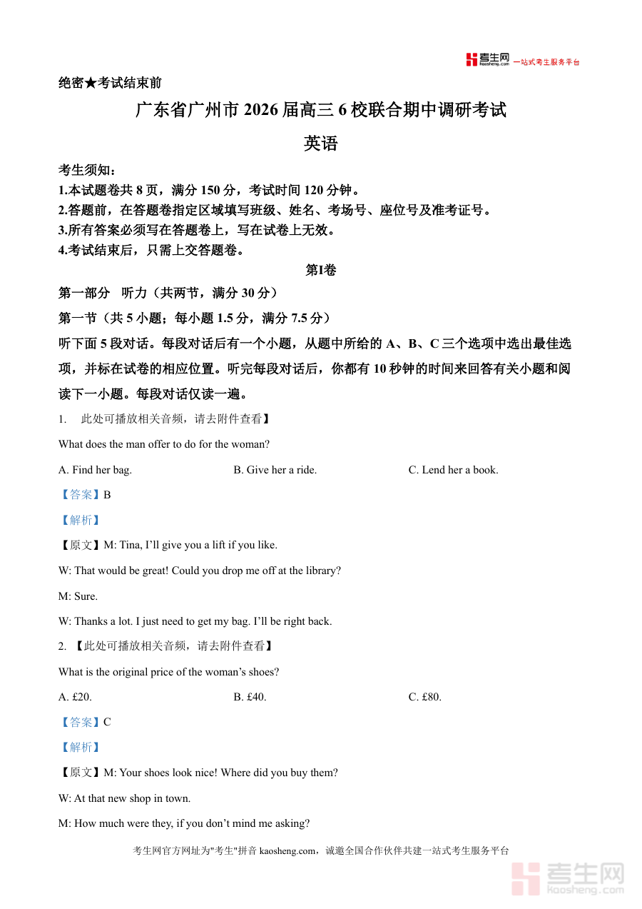 《精品解析:广东省广州市2025-2026学年高三上学期6校联合期中调研考试英语试题(解析版).docx》是一份针对广州地区高三学生英语备考的专业真题解析资料,涵盖听力、阅读、写作等全题型完整试题及逐题深度解析。资料亮点在于听力部分附完整对话及独白原文,并结合语境分析选项设置逻辑;阅读题不仅提供答案,还拆解文章结构与命题意图;写作部分给出范文及评分标准解读。作为优质备考资料,它精准匹配本地联考的难度与考点分布,帮助学生快速把握题型特点与命题趋势。