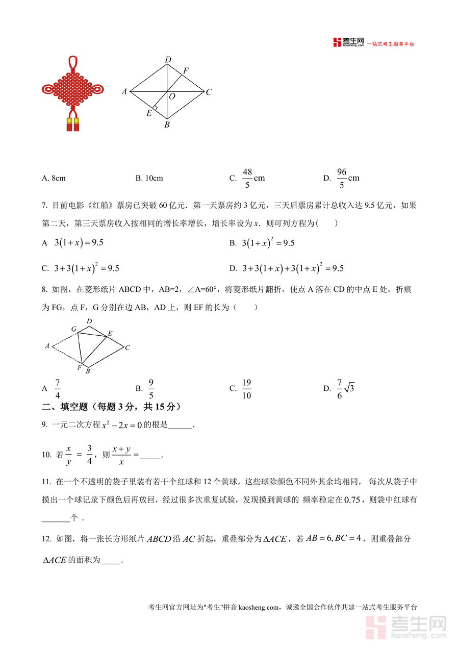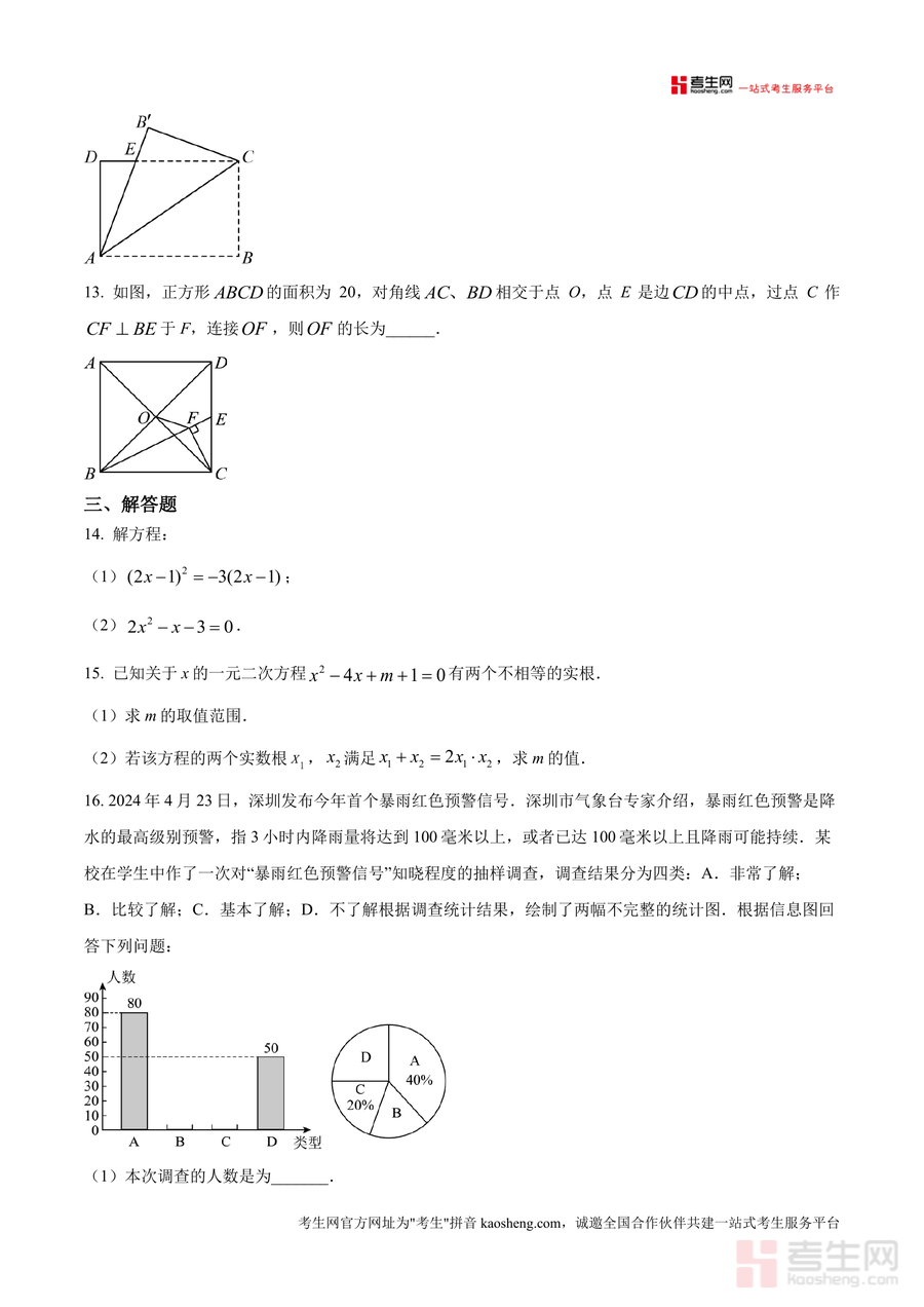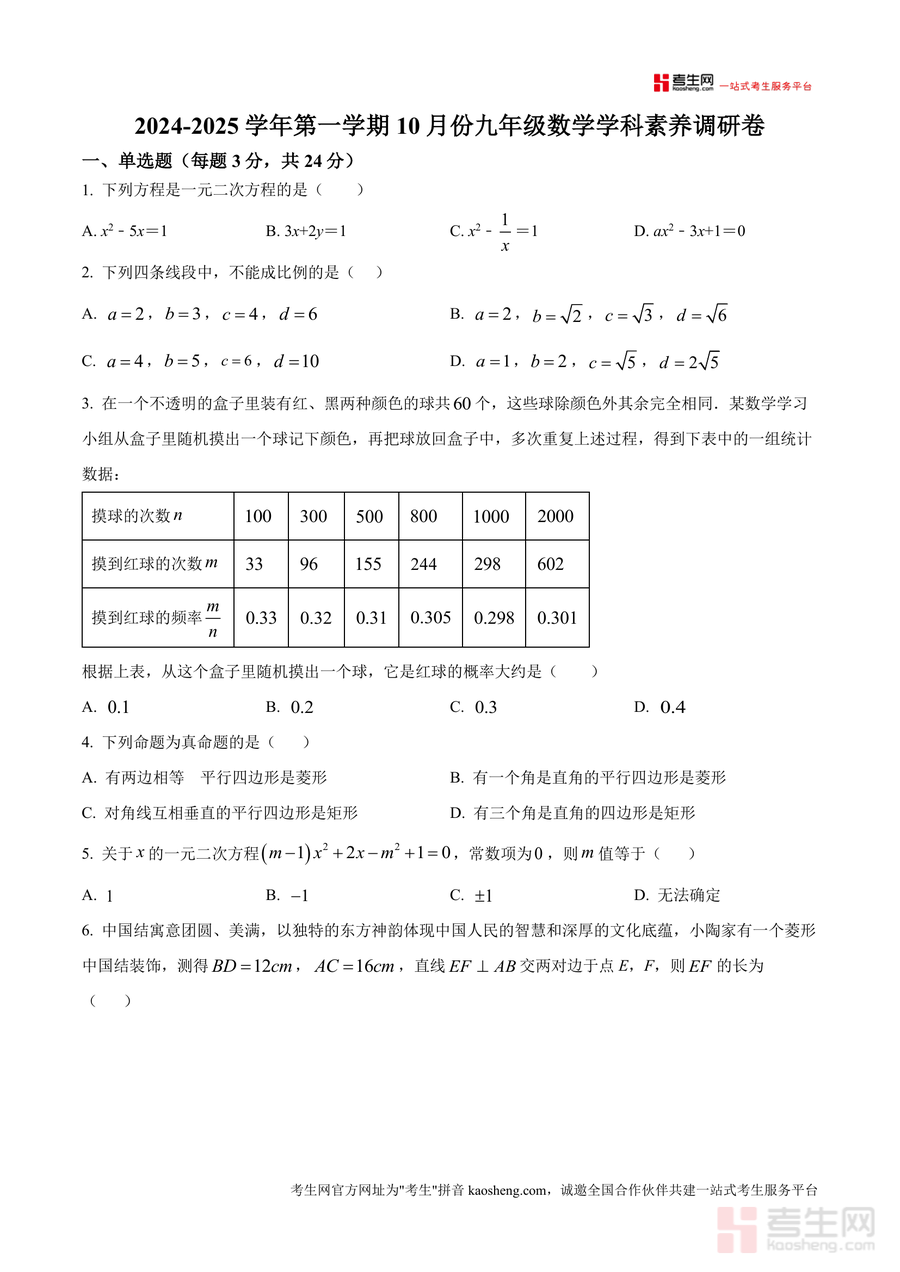 《精品解析:广东省深圳市光明区理创实验学校2024—2025学年九年级上学期10月月考数学试卷(原卷版).docx》是一份针对深圳光明区理创实验学校九年级学生设计的月考真题备考资料。该资料涵盖九年级上学期数学核心知识点,题型包括单选题(8道)、填空题(5道)及解答题(7道),内容涉及一元二次方程识别与求解、概率实际应用、菱形与正方形等几何图形性质探究、函数关系式建立及利润计算等模块。其特色亮点在于严格贴合该校学情与教学进度,试题设置既注重基础知识考查又融入综合性问题,能有效反映学生对阶段知识点掌握情况,为后续学习提供精准反馈。