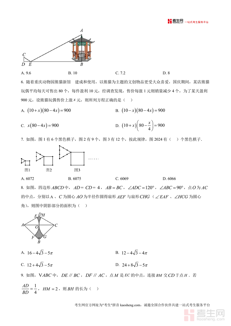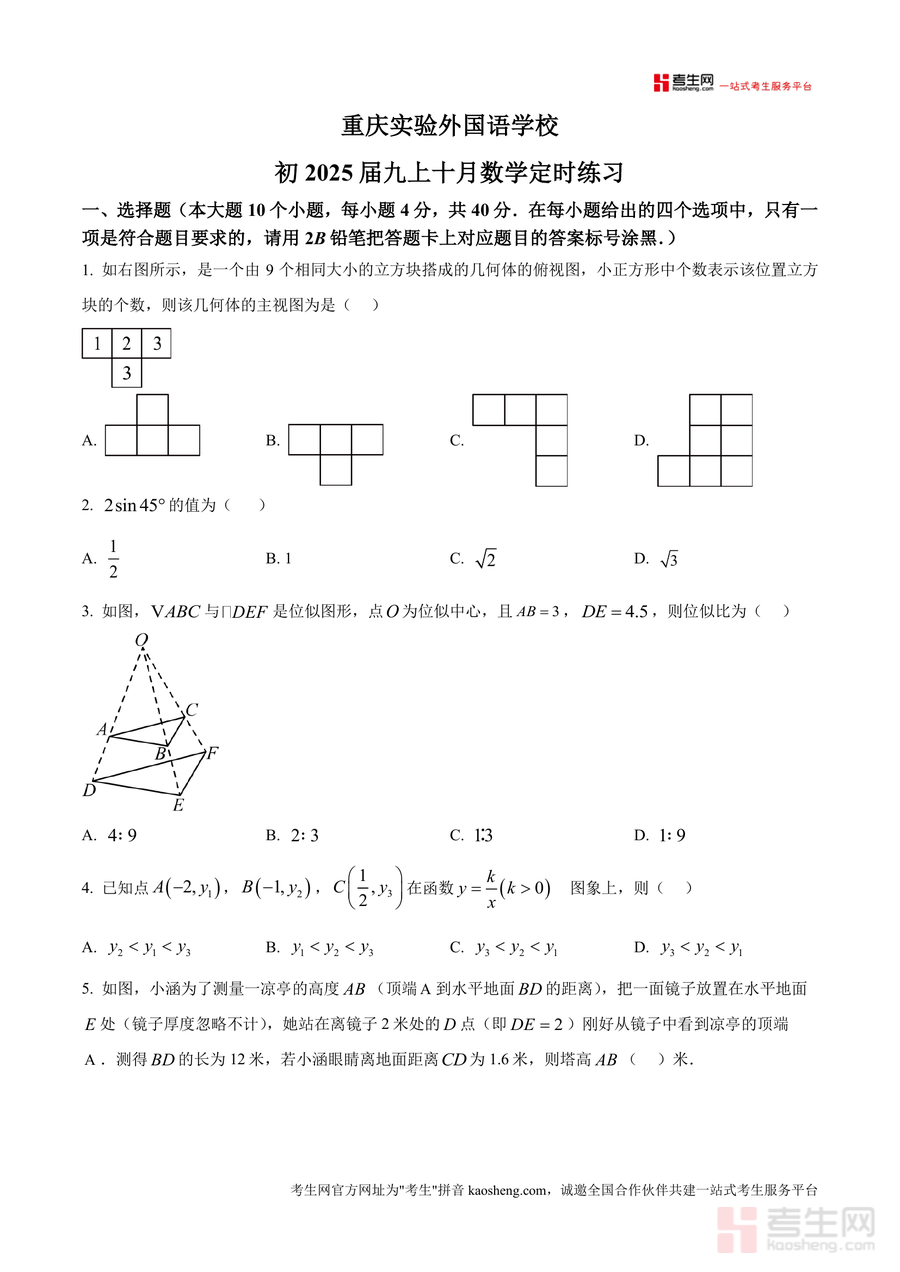 《精品解析:重庆市九龙坡区四川外国语大学附属外国语学校2024-2025学年九年级上学期10月月考数学试题(原卷版).docx》是一份来自重庆重点中学(四川外国语大学附属外国语学校)最新学年(2024-2025)九年级上学期10月月考数学原卷试题。作为备考资料,它全面涵盖了九年级数学上册核心知识点,包括几何图形、函数应用、概率统计等内容。特色亮点在于题目设计结合实际情境,如熊猫文创销售、景区测量等,既考查基础知识又培养应用能力;题型结构完整,包含选择题、填空题、解答题三大类,符合中考命题趋势;题目难度梯度合理,从基础到拔高,适合不同层次学生使用。