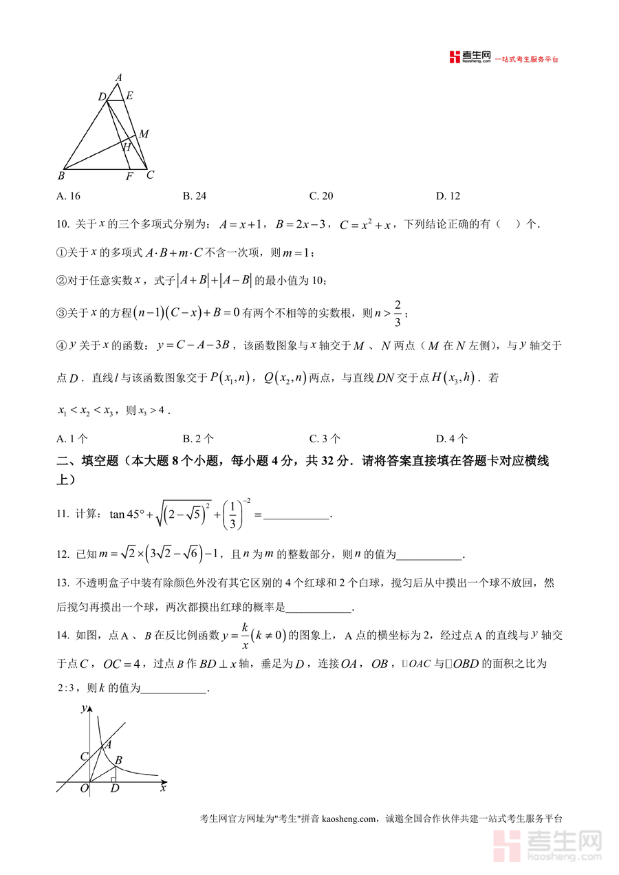 这份资料主要用于九年级学生课堂练习、课后复习及模拟考试场景。作为真题解析参考资料,它能帮助学生熟悉考试题型和命题规律,掌握解题技巧和思路;通过真实考试体验,提升应试能力和心理素质;了解重点学校出题方向和难度,针对性调整学习策略。备考优势在于提供第一手真实试题,避免盲目刷题;题目解析详细(虽然这里是原卷版,但作为配套资料可引导学生自主思考),帮助学生查漏补缺;结合实际问题设计,培养学生应用数学解决实际问题能力。