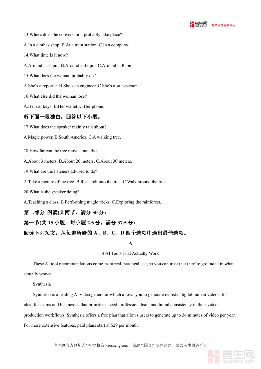 《精品解析:河南省郑州市宇华实验学校2025-2026学年高三上学期一模英语试题(解析版)》是一份聚焦高三英语备考核心需求的高质量真题解析资料。该资料完整收录了宇华实验学校高三上学期第一次模拟考试的英语试题及对应解析,涵盖听力(含两节共20小题)、阅读(含第一节四篇短文)等高考核心题型,其特色亮点在于解析部分不仅提供精准标准答案,还针对每道题目的题干语境、命题意图、解题步骤及常见易错点进行分层拆解与深度剖析,帮助使用者快速掌握考点逻辑与答题技巧。作为区域重点学校的模考试题解析,该资料充分结合河南省高考英语命题趋势与宇华实验学校的教学特色,为备考资料注入了更强的针对性与实用性,是高三学生提升英语应试能力的重要参考工具。