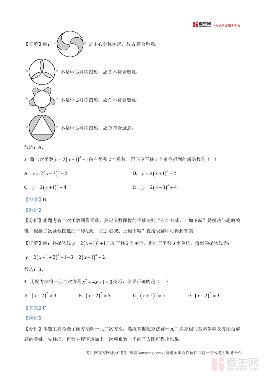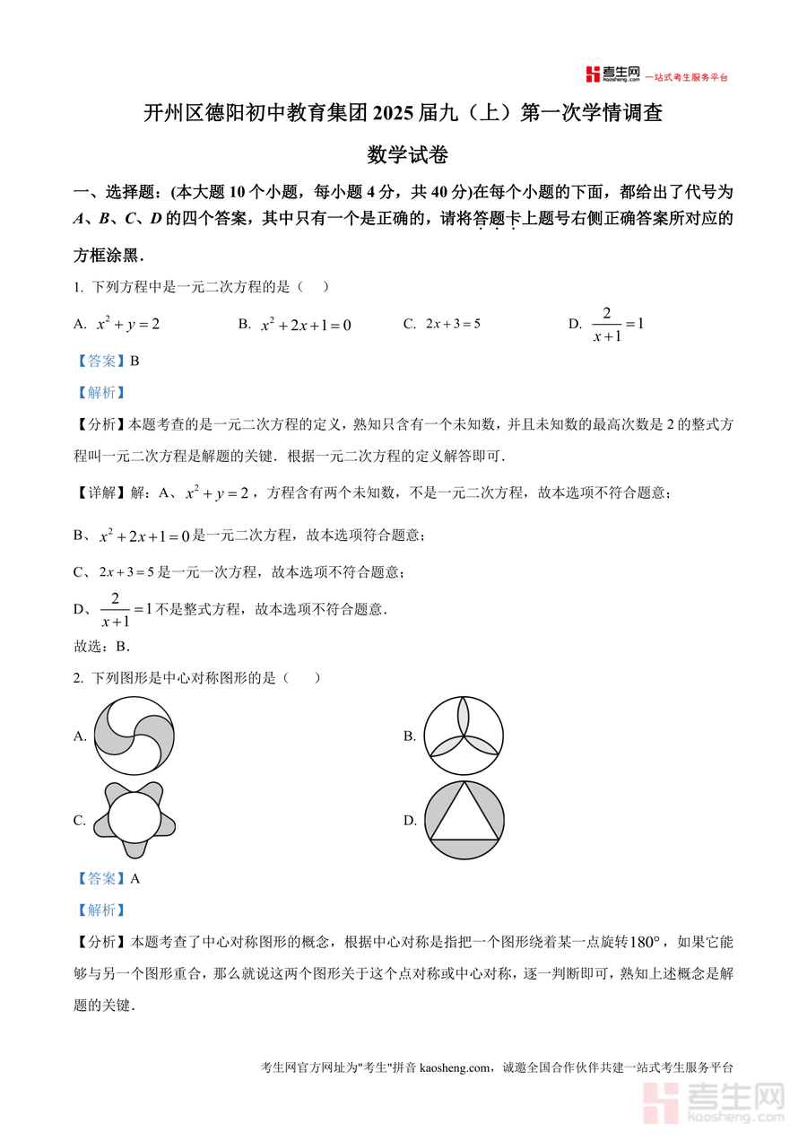 《精品解析:重庆市开州区德阳初中教育集团2024-2025学年九年级上学期第一次学情调查数学试卷(解析版)》是一份针对该教育集团九年级数学学情调查试卷打造专业备考资料,涵盖选择题(10小题)\填空题(8小题)及解答题(8小题)等完整题型,每个题目均配有详细解析。解析内容包含考点定位(如一元二次方程定义判断\中心对称图形识别)及解题思路(如利用配方法变形方程\二次函数图像平移法则应用)等核心要素,并结合本地教学实际突出重点知识,帮助学生深入理解题目背后原理。