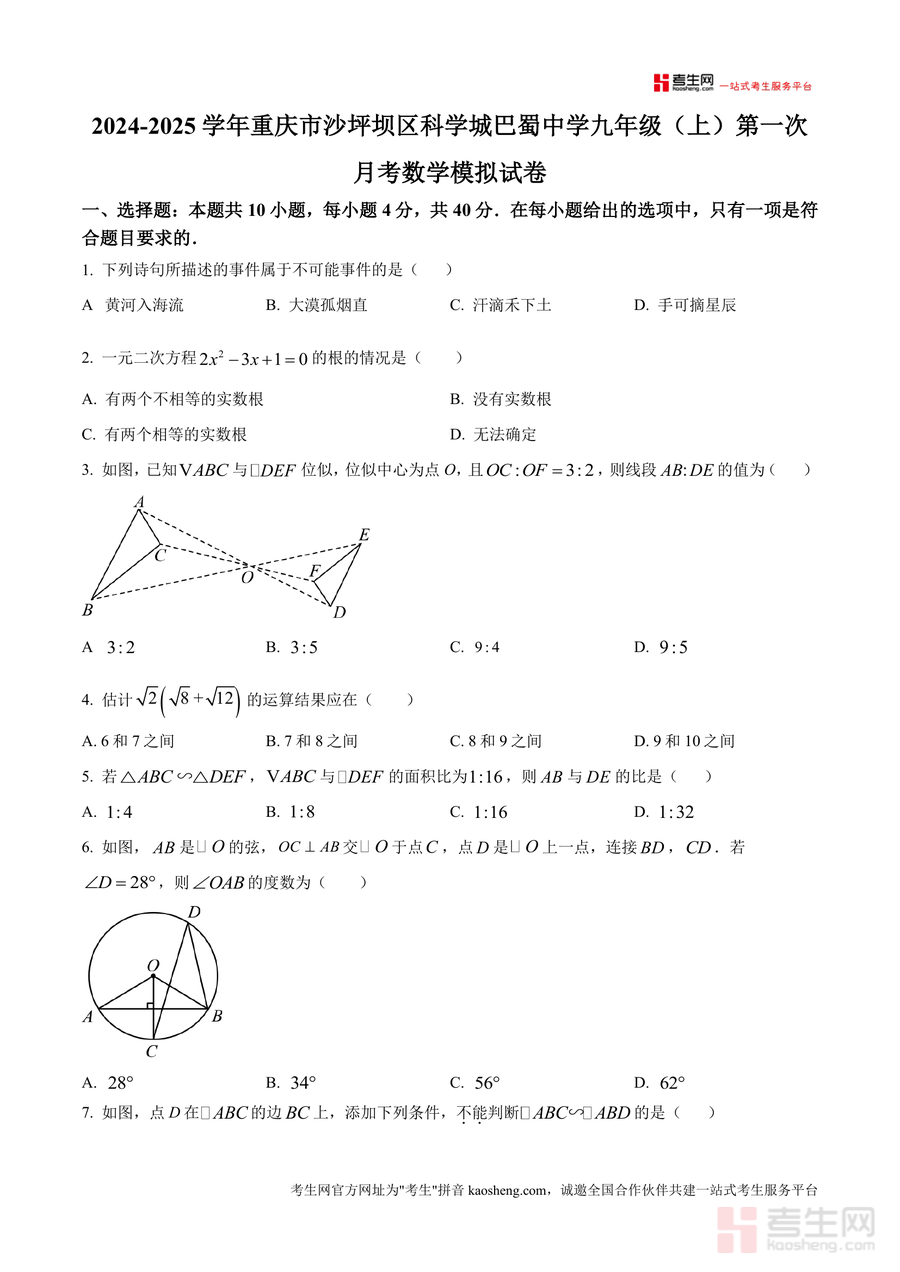 《精品解析:重庆市沙坪坝区科学城巴蜀中学2024-2025学年九年级上学期第一次月考数学模拟试卷(原卷版)》是一份针对该中学九年级上学期首次月考设计的专业数学备考资料,聚焦九年级上册核心知识点,包含选择题(10小题,40分)、填空题(8小题,32分)及解答题(8小题,78分)三大题型模块。内容覆盖概率事件判断、一元二次方程根判别式、相似三角形性质、三角函数计算、圆与几何综合等高频考点,并严格遵循该校月考命题风格与难度梯度设置,精准还原真实考试场景布局及题型分值占比。