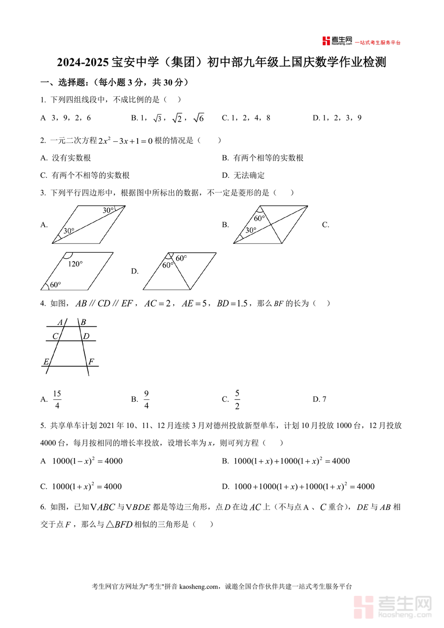 《精品解析:广东省深圳市宝安中学(集团)初中部2024—-2025学年上学期九年级国庆数学作业检测 (原卷版).docx》是一份针对九年级学生国庆期间数学学习效果进行阶段性评估的高质量检测资料。其主要内容涵盖选择题(30分)、填空题(15分)及计算题(55分)三大题型共22道题目,覆盖比例线段判定、一元二次方程根的判别、菱形与矩形性质应用、相似三角形判定与计算、黄金分割及图形旋转等九年级上册核心知识点。特色亮点在于题目设计紧密贴合深圳本地教学进度与中考命题趋势,既包含基础巩固类题目以夯实核心概念,也设置能力提升及拓展探究类题目以培养学生综合运用知识解决问题的能力。