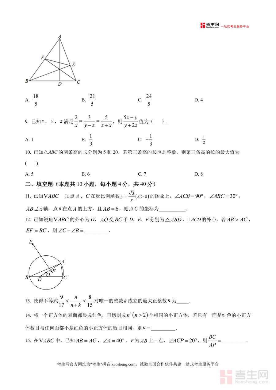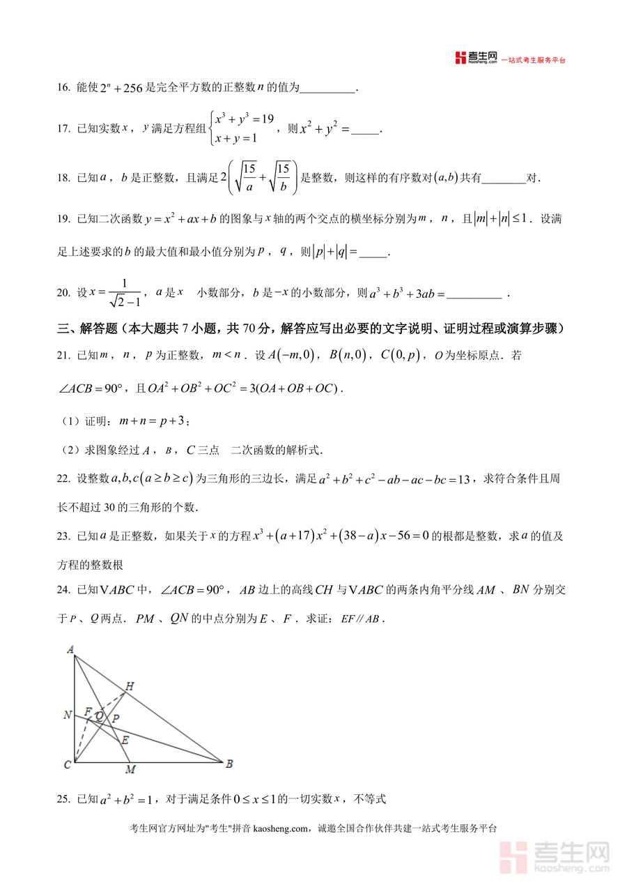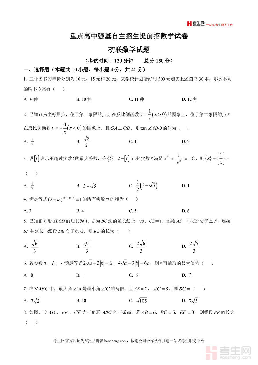 《精品解析:2025年12月重庆市重点高中强基自主招生提前招初联数学试题(原卷版).docx》是一份针对重庆市重点高中强基自主招生及初中数学联赛(初联)备考的专业资料。该资料包含完整原卷内容,试卷结构分为选择题(10小题共40分)、填空题(10小题共40分)和解答题(7小题共70分),考试时长120分钟、总分150分。其特色亮点在于紧密贴合重庆本地重点高中招生命题趋势与初联数学核心考点,覆盖代数方程、几何图形、数论基础等关键模块,题目设置兼具选拔性与创新性,能精准反映强基计划对学生数学思维与综合能力的要求。