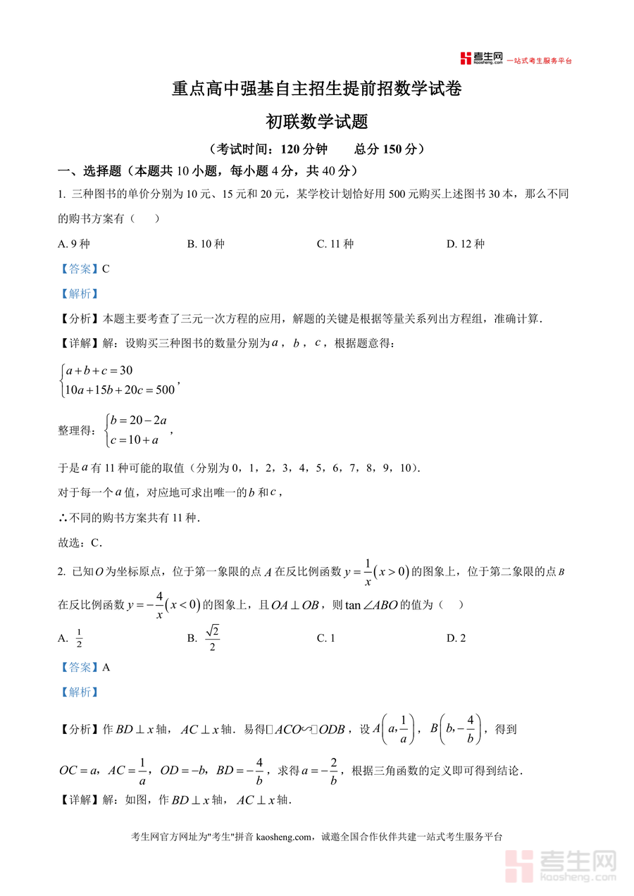 《精品解析:2025年12月重庆市重点高中强基自主招生提前招初联数学试题(解析版).docx》是一份聚焦重庆市重点高中强基自主招生提前招需求,融合初联数学核心考点与真题训练功能于一体备考资料。文件包含完整试题及逐题深度解析,覆盖选择题(如三元一次方程应用、反比例函数与相似三角形结合)、填空题(如外心性质应用)、解答题(如二次函数解析式求解)等题型;特色亮点在于每道题均配备考点定位、详细解题步骤及技巧总结,例如构造辅助线解决几何综合题、利用绝对值非负性突破代数问题等,自然融入真题解析与应试能力提升核心导向。