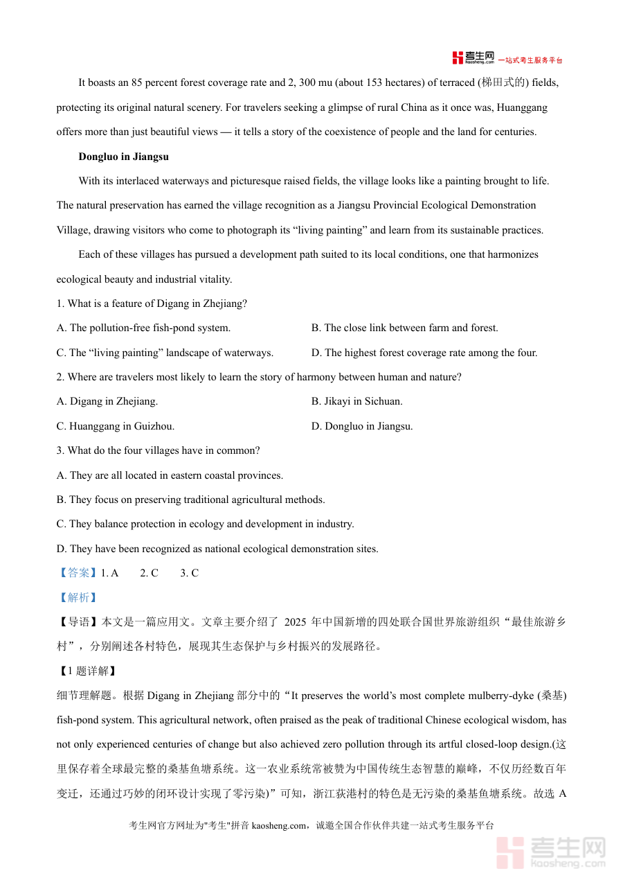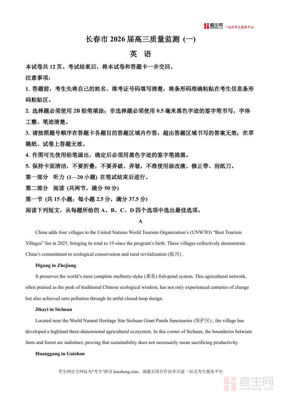 《精品解析:2026届吉林省长春市高三质量监测(一)英语试卷(解析版).docx》是一份聚焦2026届长春市高三英语备考需求的权威真题解析资料,包含完整试卷原题及各题型深度解析内容。资料覆盖听力(笔试后进行)、阅读等核心考试板块,其中阅读部分选取中国新增联合国世界旅游组织“最佳旅游乡村”等具有时代性与教育意义的文本;解析不仅提供精准答案,还详细拆解题目考点(如细节理解题的文本定位技巧)、文本背景知识(如生态保护与乡村振兴主题)及命题逻辑,特色亮点在于将真题训练与应试能力培养有机结合。