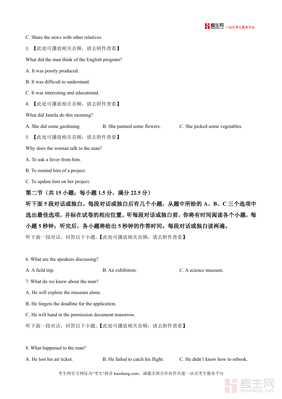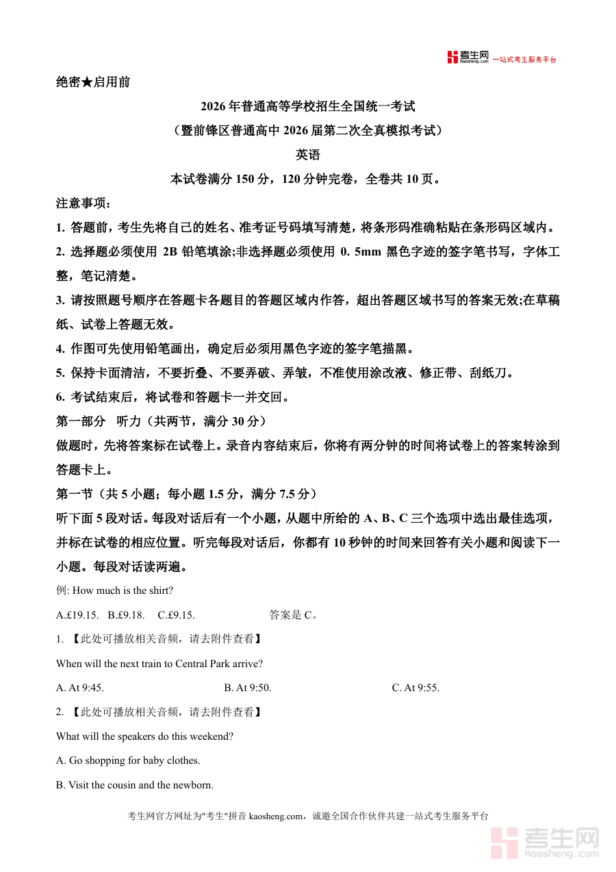 《精品解析:2026届四川省广安市前锋区高三二模英语试题(原卷版)docx》是一份针对四川省广安市前锋区2026届高三学生设计的高质量全真模拟英语考试资料。该资料严格遵循普通高等学校招生全国统一考试的命题规范与题型结构,包含听力、阅读等核心模块,完整呈现了考试的时间要求(120分钟)、分值分布(满分150分)及答题注意事项等细节。其特色在于贴合当地教学实际与高考命题趋势,能够帮助学生提前熟悉考试流程与题型特点,为备考提供真实的实战场景体验。