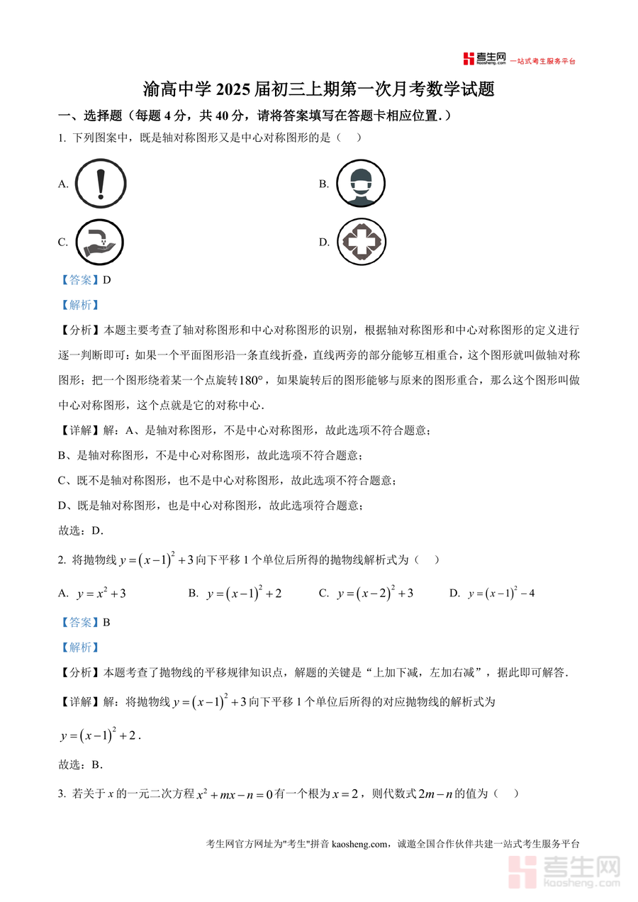 《精品解析:重庆市九龙坡区重庆市渝高中学校2024-2025学年九年级上学期10月月考数学试题(解析版).docx》是一份针对渝高中学校九年级上月考数学试题编写的高质量真题解析资料,涵盖选择题、填空题、解答题全题型内容,包含轴对称与中心对称图形识别、抛物线平移规律、一元二次方程根与代数式求值、二次函数图像性质及旋转性质应用等核心考点。资料特色在于每道题均配备详细的考点分析、步骤拆解及易错点提示,解析逻辑严谨且贴合学生认知水平,能帮助学生快速理解解题思路与方法。