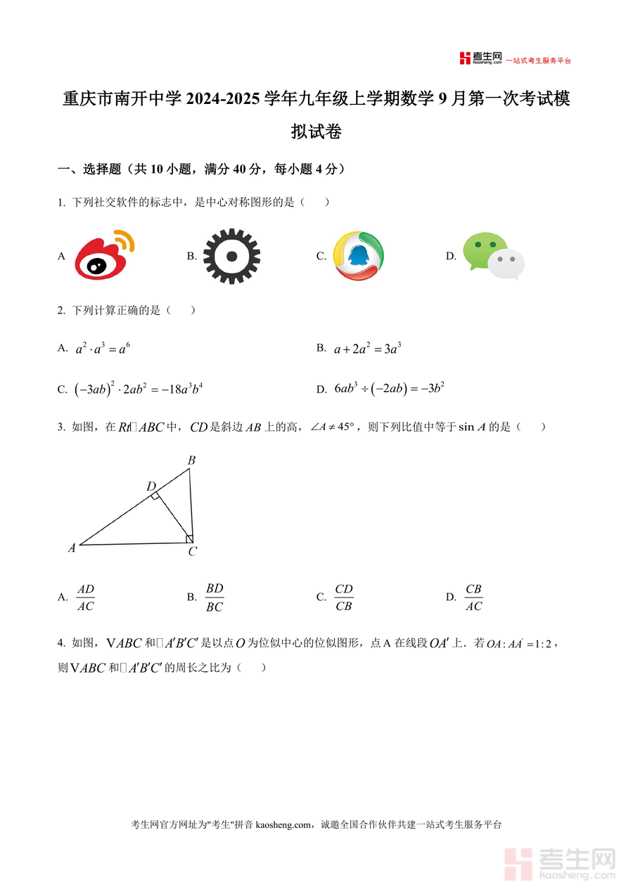 本资料适用于备战重庆南开中学九年级9月月考的学生、九年级数学教师及关注名校数学命题趋势的教研人员。作为贴合本地名校考情的备考资料,它具有不可替代性:原卷版呈现形式能让学生真实模拟考试环境,试题内容与月考考点高度契合。其长期价值在于不仅可用于考前冲刺,还能作为九年级上册数学知识点巩固的优质素材,助力学生构建系统知识体系,为后续中考备考奠定基础。