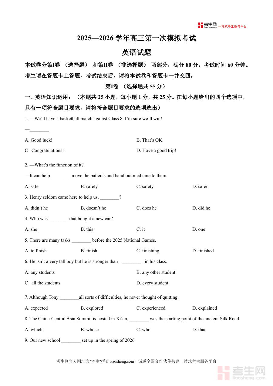 《精品解析:2026届山东省高三第一次模拟考试英语试题(原卷版)》是一份针对2026届山东省高三学生打造的高质量备考资料,完整呈现了2025—2026学年高三第一次模拟考试英语试题的原卷内容。该资料严格遵循山东省高考英语命题规范,包含第Ⅰ卷(选择题55分)和第Ⅱ卷(非选择题)两部分,覆盖英语知识运用(含语法、词汇辨析等25道选择题)、阅读理解(如书信类文本阅读等15道选择题)等核心题型,保留了原卷的分值设置(满分80分)、考试时长(60分钟)及“考生在答题卡答题”等细节要求,能让使用者真实感受模考场景的规范性与严谨性。其特色在于贴合山东本地高考命题趋势,题型分布与真题高度一致,为学生提供原汁原味的模考体验。