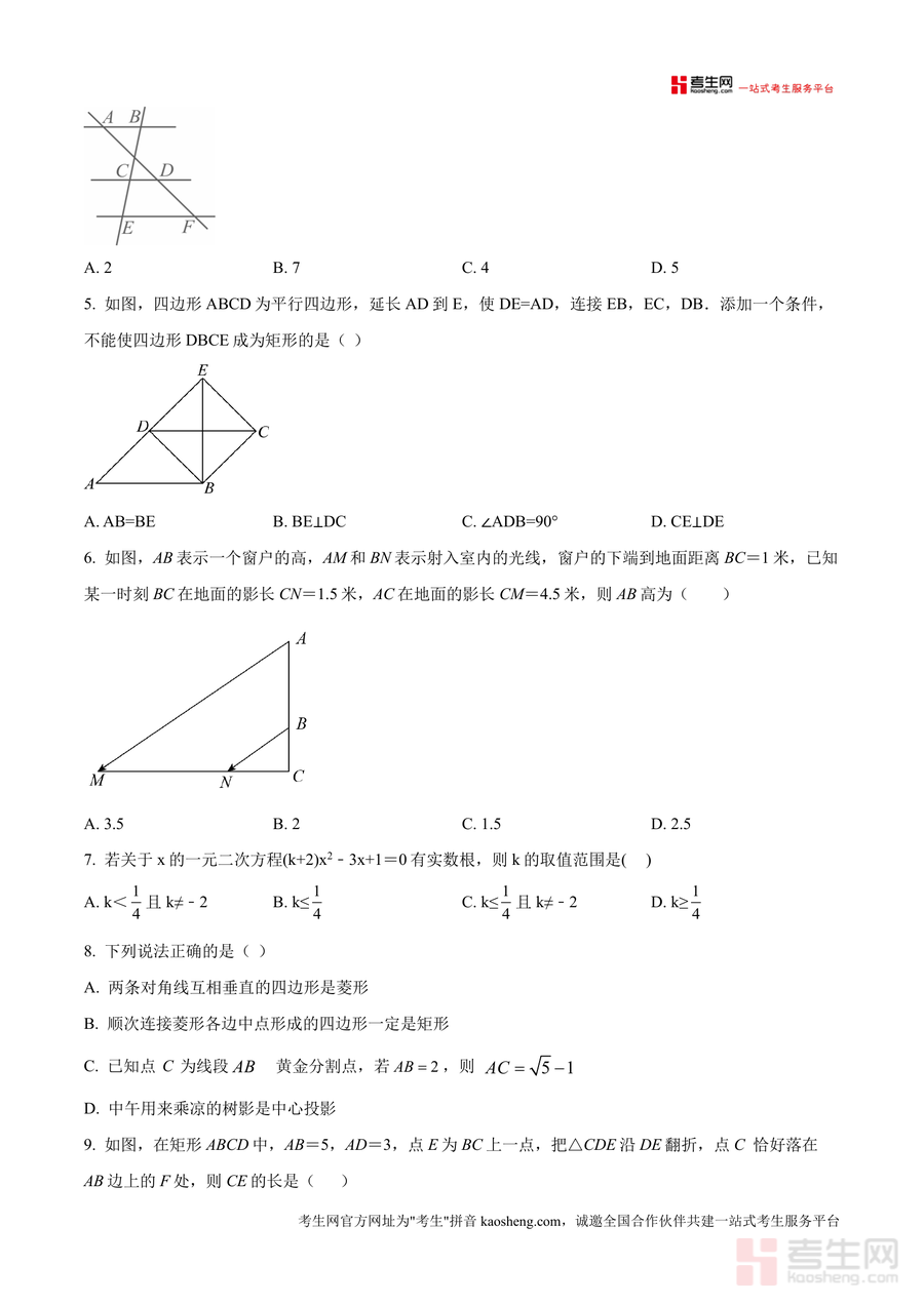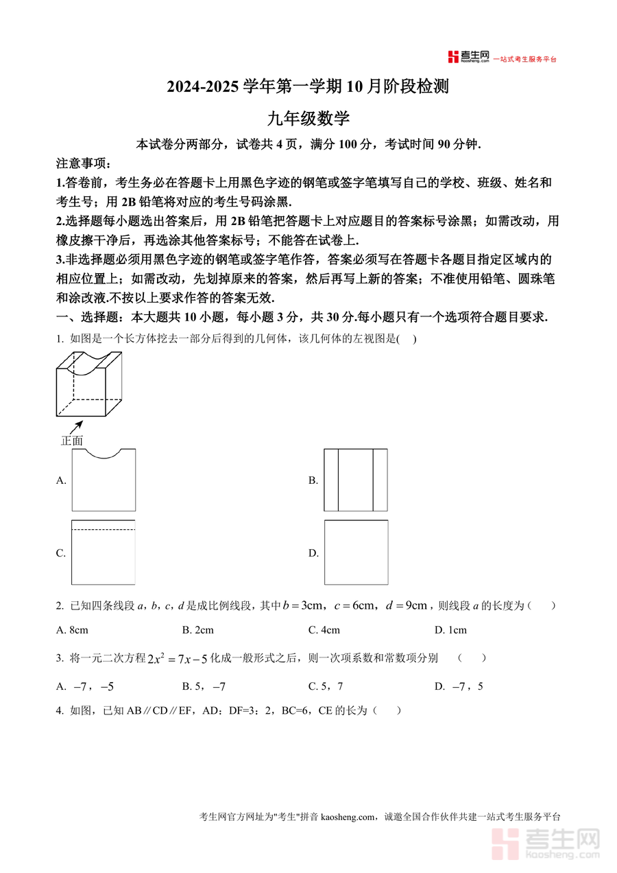 《精品解析:广东省深圳市龙华区外国语学校2024-2025学年上学期九年级10月月考数学试卷(原卷版).docx》是一份针对深圳龙华区外国语学校九年级学生的阶段性数学检测资料,精准贴合该校教学进度与命题风格。试卷结构完整规范,满分100分、考试时长90分钟,包含选择题(10小题)、填空题(5小题)及解答题(11小题)三大模块,覆盖几何视图、比例线段、一元二次方程解法与应用、平行四边形及矩形性质、相似三角形实际应用、黄金分割等九年级上册核心知识点。作为原卷版资料,其保留了真实考试的答题注意事项、题型分布及题目排版细节,能为使用者提供沉浸式模拟体验,助力夯实知识基础与提升应试能力。