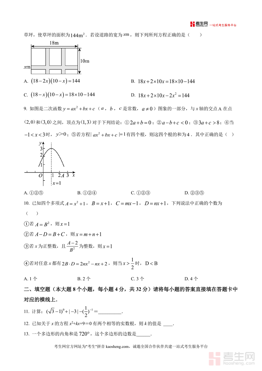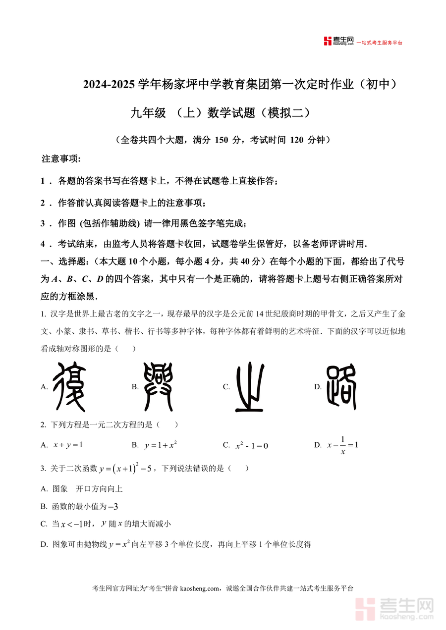 《精品解析:重庆市杨家坪中学教育集团2024-2025学年九年级上学期第一次定时作业(模拟二)数学试题(原卷版).docx》是一份服务于九年级数学阶段性复习检测的专业备考资料,核心定位为杨家坪中学教育集团内部标准化定时作业原卷。其主要内容严格遵循中考命题规范,全卷满分150分、考试时间120分钟,包含选择题(10小题40分)、填空题(8小题32分)、解答题(8小题78分)三大题型,覆盖轴对称图形识别、一元二次方程求解、二次函数性质分析、几何证明与计算、数据分析应用等九年级上学期核心知识点;特色亮点在于题目设计贴合重庆本地中考趋势,融入集团教学特色,兼具基础巩固与能力提升双重功能。