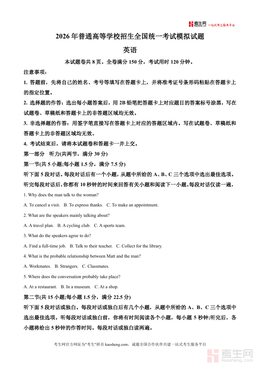 本试题适用于2026届盐山中学及河北省内同类学校的高三学生,尤其适合希望通过系统模拟训练提升高考英语成绩的学习者。作为高质量备考资料,它不仅帮助学生掌握考试技巧,更培养应试心态与时间管理能力,是高考英语复习不可或缺的重要资源。其不可替代性体现在对本地考试趋势的精准把握与真题级试题质量上,长期价值在于为学生构建扎实应试基础,助力高考取得优异成绩。