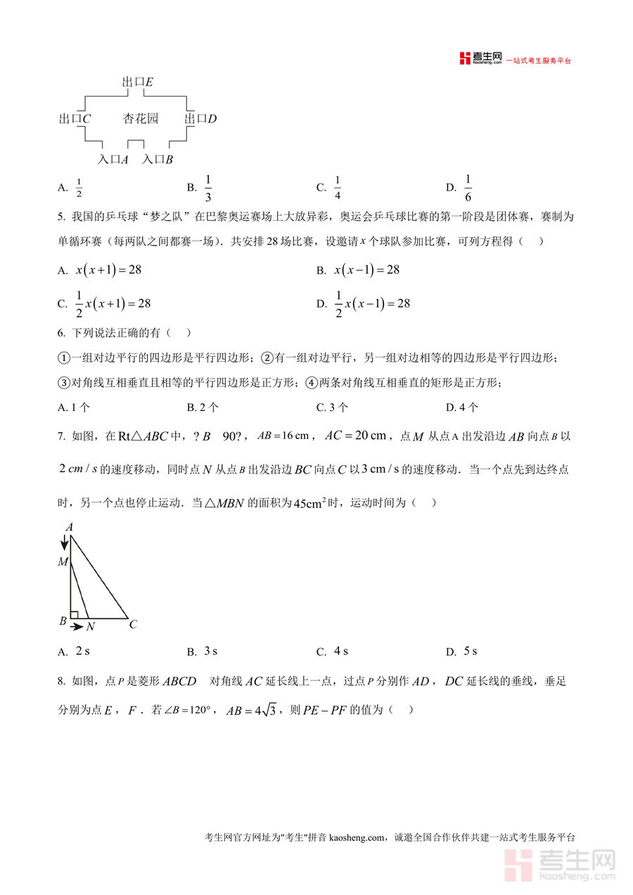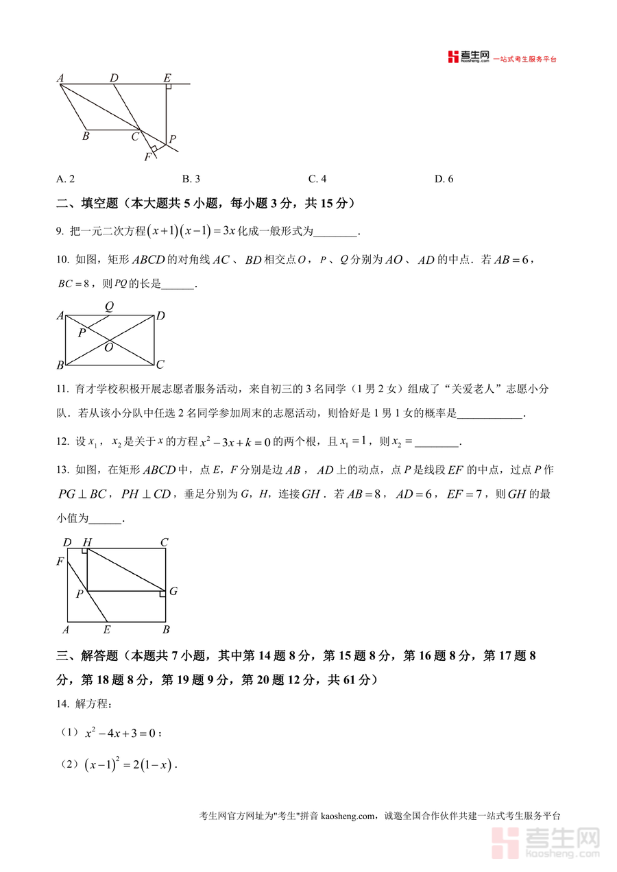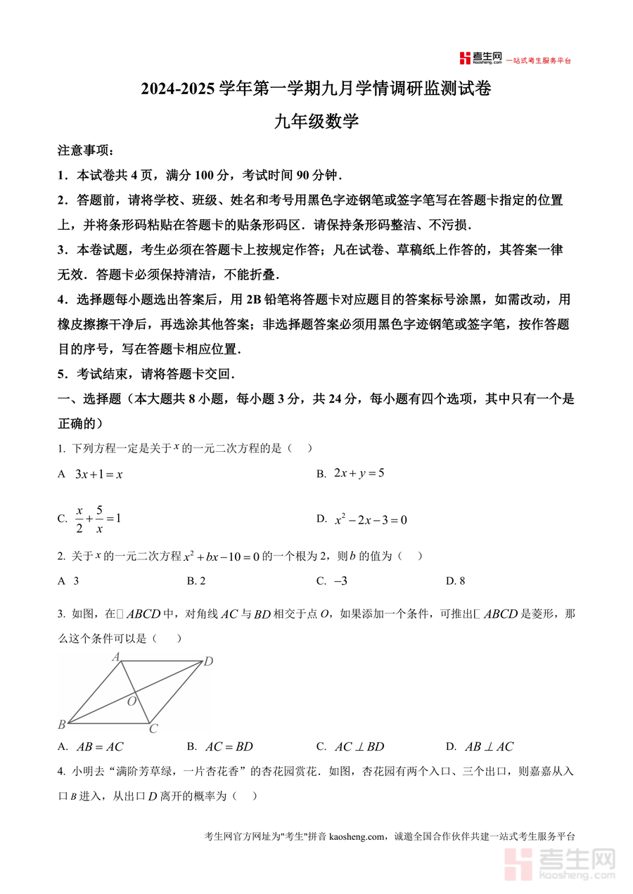 《精品解析:广东省深圳市龙岗区两校2024-2025学年九年级上学期九月学情调研监测九年级数学试卷(原卷版).docx》是一份针对广东省深圳市龙岗区两校九年级学生设计的开学初学情调研监测数学原卷资料。其主要内容涵盖选择题8道(涉及一元二次方程定义与根的应用、平行四边形及菱形判定等核心知识点)、填空题5道(包含矩形性质应用、概率计算、根与系数关系等内容)以及解答题7道(覆盖方程求解、几何证明、实际应用问题、动点问题等题型)。该试卷特色亮点在于严格遵循当地教学大纲与考试要求,题型结构合理且贴合两校教学进度与学生实际学情,能精准反映学生开学初期对九年级数学知识体系中重点内容的掌握程度与应用能力。