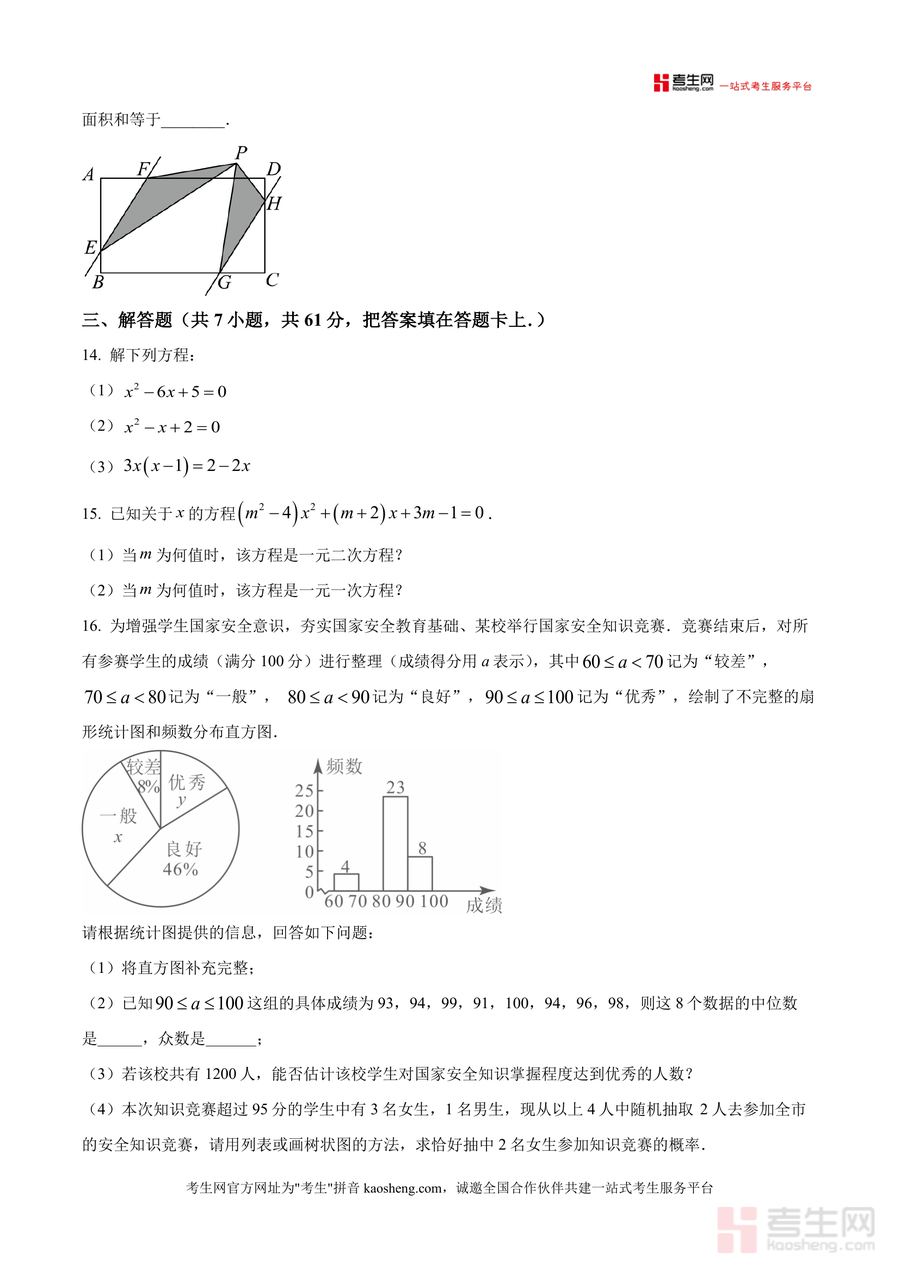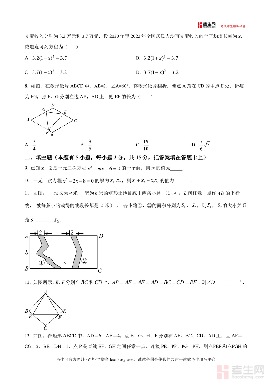 该试题核心用途为九年级学生自我检测新学期数学知识掌握程度、教师开展备课与学情分析的重要参考依据。使用场景包括学生课后巩固练习以查漏补缺、模拟月考训练以熟悉考试节奏;教师可通过试题把握班级学生对一元二次方程根判别式应用或几何折叠问题等重难点知识的掌握情况,并调整后续教学策略。用户价值方面:学生借助试题能快速定位薄弱环节并针对性提升应试能力;教师则可利用原卷了解本地校命题趋势,优化教学内容设计。备考优势在于其原卷版真实性,让学生提前适应月考题型分布与时间要求,减少考试陌生感。