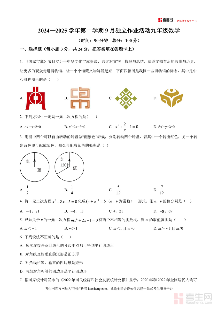 《精品解析:广东省深圳市龙岗区智民实验学校2024-2025学年九年级上学期9月月考数学试题(原卷版)》是一份针对九年级上学期起始阶段数学学习成果检测的优质备考资料,涵盖中心对称图形识别、一元二次方程概念与解法、概率计算、菱形矩形正方形等几何图形性质及应用、统计与概率综合实践等九年级上册核心知识点。试题结构完整且贴合该校教学进度与本地考情:包含8道选择题(每题3分)、5道填空题(每题3分)及7道解答题(含实践操作与综合探究),全面覆盖基础概念理解、计算能力、逻辑推理及应用创新等多维考查目标。其特色亮点在于保留了学校月考原题真实题型与难度梯度,能精准反映该校教学重点与命题方向。