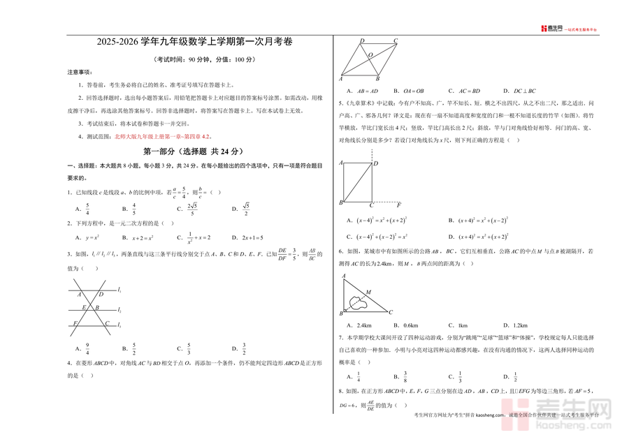 《九年级数学第一次月考卷【测试范围:北师大版九上第1~4.2章】(考试版A3).docx》是一份针对北师大版九年级上册前四章部分内容的阶段性检测资料,聚焦比例线段、一元二次方程、平行四边形及特殊四边形、概率统计等核心知识点。试卷严格遵循中考命题规范设计结构:考试时间90分钟满分100分,题型涵盖选择题(8小题24分)、填空题(5小题15分)、解答题(7小题61分);题目设置兼顾基础巩固与能力提升,如选择第5题结合《九章算术》情境考查一元二次方程应用,解答题第20题以正方形为背景设计多问综合题锻炼逻辑推理能力,整体内容精准匹配月考测试范围与学生阶段性学习需求。