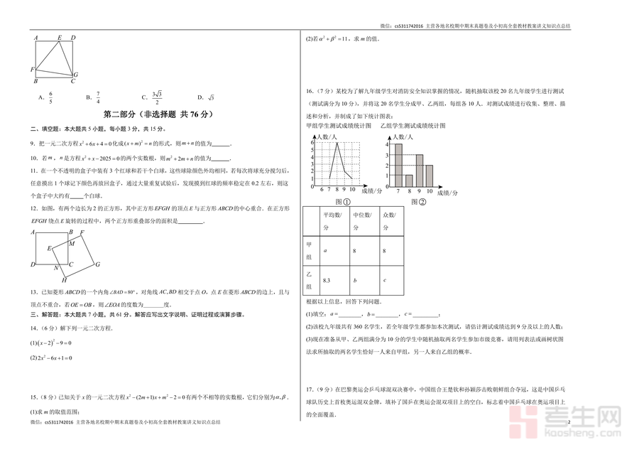 该试卷核心用途为九年级学生第一次月考考前备考训练及教师教学效果评估工具。学生可通过限时完成试卷进行自测模拟:一方面熟悉月考题型结构与答题规范(如按答题卡填涂要求练习选择题作答);另一方面针对性检测比例线段应用、特殊四边形证明、概率计算等模块掌握情况,并通过综合题(如第19题矩形动点问题)提升解题思维与应试能力。教师可将其作为课堂测试或作业布置,借助试卷数据精准分析班级共性薄弱点(如一元二次方程解法、统计概率应用),为后续教学调整提供依据;同时试卷情境化题目设计(如第17题乒乓球拍销售增长率问题)能帮助学生建立数学与实际生活联系。