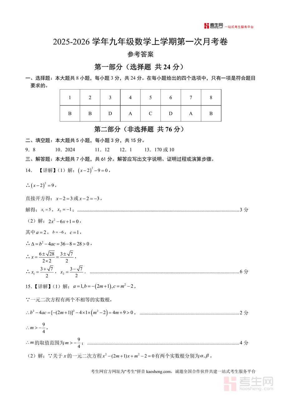 《九年级数学第一次月考卷(参考答案)(深圳专用,北师大版).docx》是一份针对深圳地区使用北师大版教材九年级学生设计的第一次月考配套参考资料。其核心定位为辅助学生与教师完成月考后反馈与巩固的专业备考资料,主要内容涵盖选择题(8小题)、填空题(5小题)、解答题(7小题)三大题型,覆盖一元二次方程求解与判别式应用、统计图表分析与概率计算、几何图形证明与性质应用、实际应用题(销售增长率等)等核心知识点。特色亮点在于严格适配深圳本地教学进度与考纲要求,北师大版教材同步性强;解答部分提供完整演算步骤与逻辑推导,如代数题的公式应用过程、几何题的辅助线添加思路、统计题的数据分析方法等,助力用户理解解题本质。