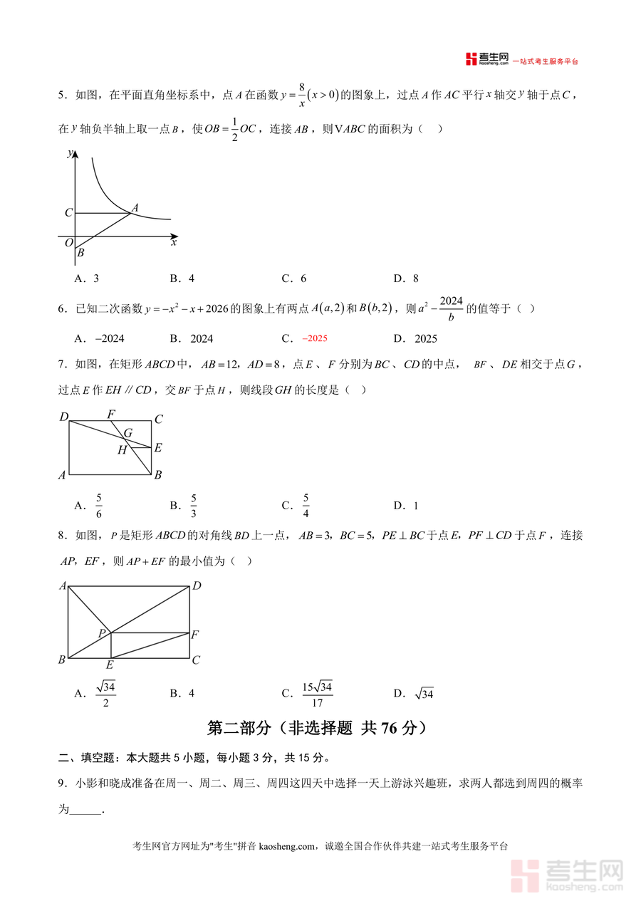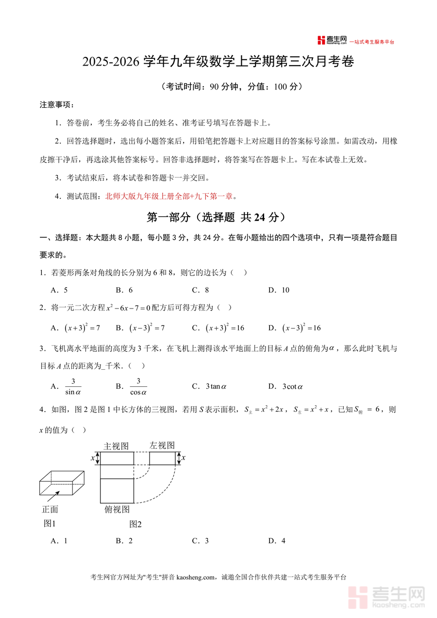 《九年级数学第三次月考卷【测试范围:北师大版九上全部+九下第一章】(考试版).docx》是一份针对北师大版九年级数学阶段性学习成果的标准化月考模拟备考资料。其测试范围涵盖九年级上册全部核心知识模块,包括一元二次方程解法、特殊四边形性质、概率统计应用等,并延伸至九下第一章直角三角形的边角关系,形成完整的阶段知识覆盖体系。资料题型设计贴合中学数学考试规范:含8道选择题(24分)、5道填空题(15分)及7道解答题(61分),考试时间90分钟、满分100分,与实际月考设置完全一致。特色亮点在于题目梯度分层清晰:基础题聚焦概念理解(如菱形边长计算、二次函数点坐标分析);综合题注重知识迁移(如图解一元二次方程、反比例函数与一次函数综合应用);创新题融合学科思维(如几何折叠问题中的角度与长度求解)。